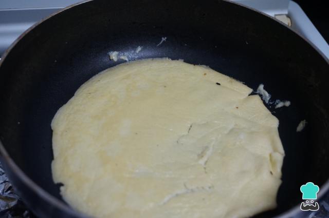 Adicione com uma colher em formato de concha à panela e cubra a base com a massa de crepe low carb, até que as bordas fiquem visíveis.