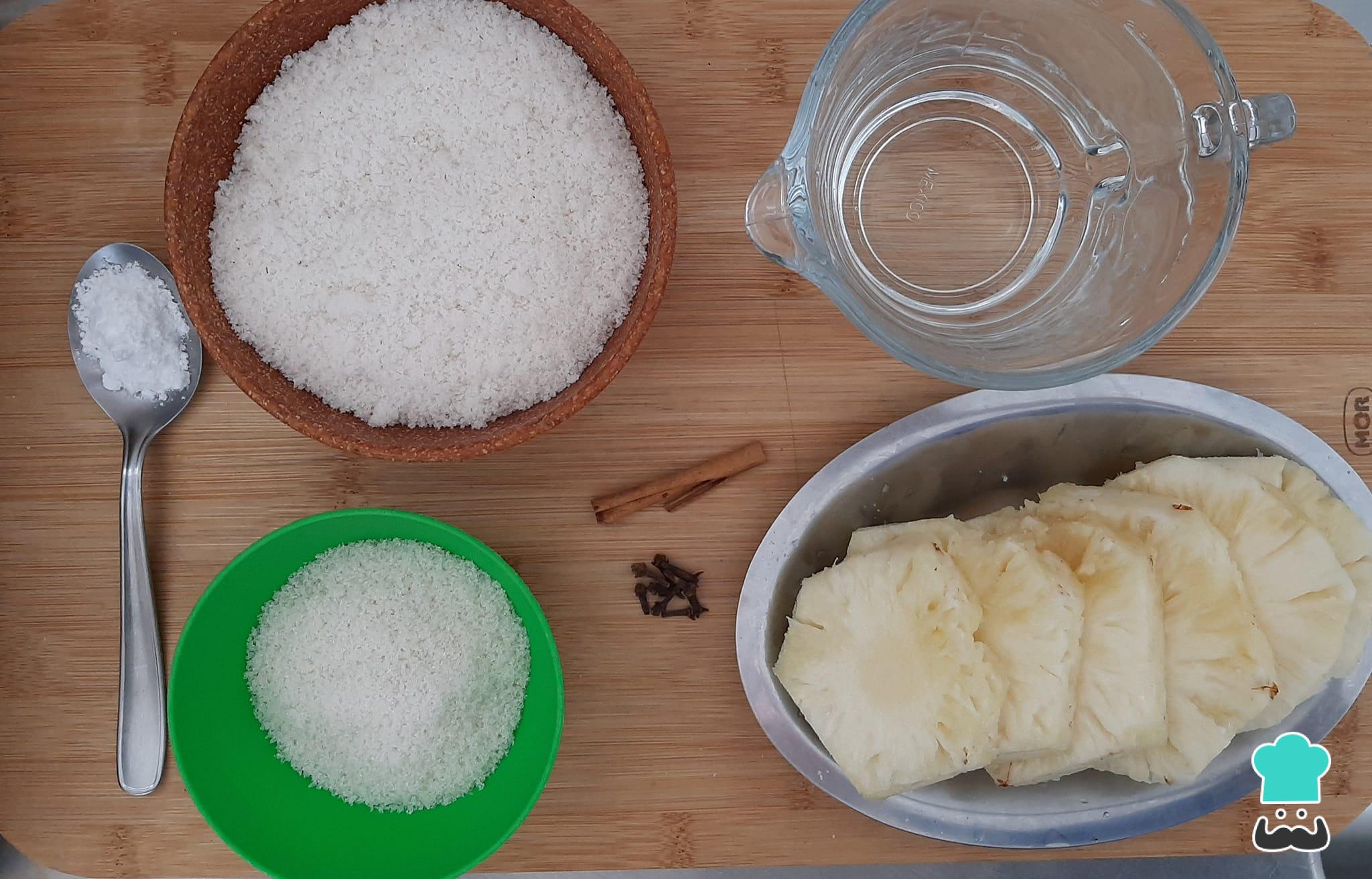 Separe os ingredientes necessários para preparar esse doce de abacaxi em pedaços.