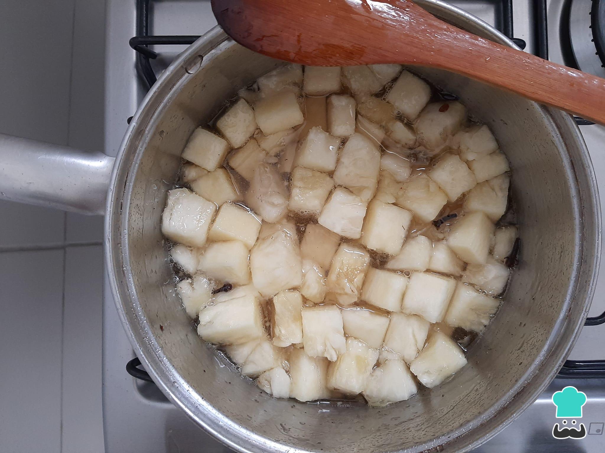 Escorra o abacaxi que estava na solução de água com bicarbonato de sódio e adicione os pedaços da fruta na calda preparada.