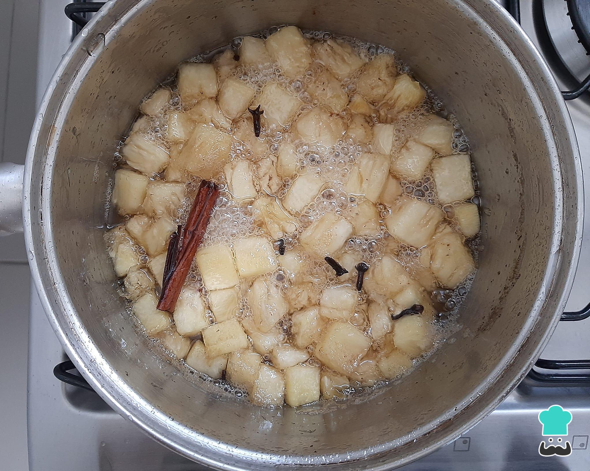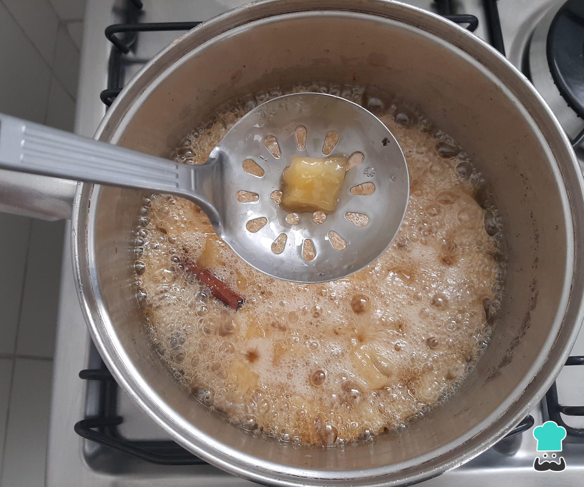 Enquanto o abacaxi está de molho na solução com bicarbonato de sódio, prepare a calda de açúcar que irá banhar os pedaços da fruta.