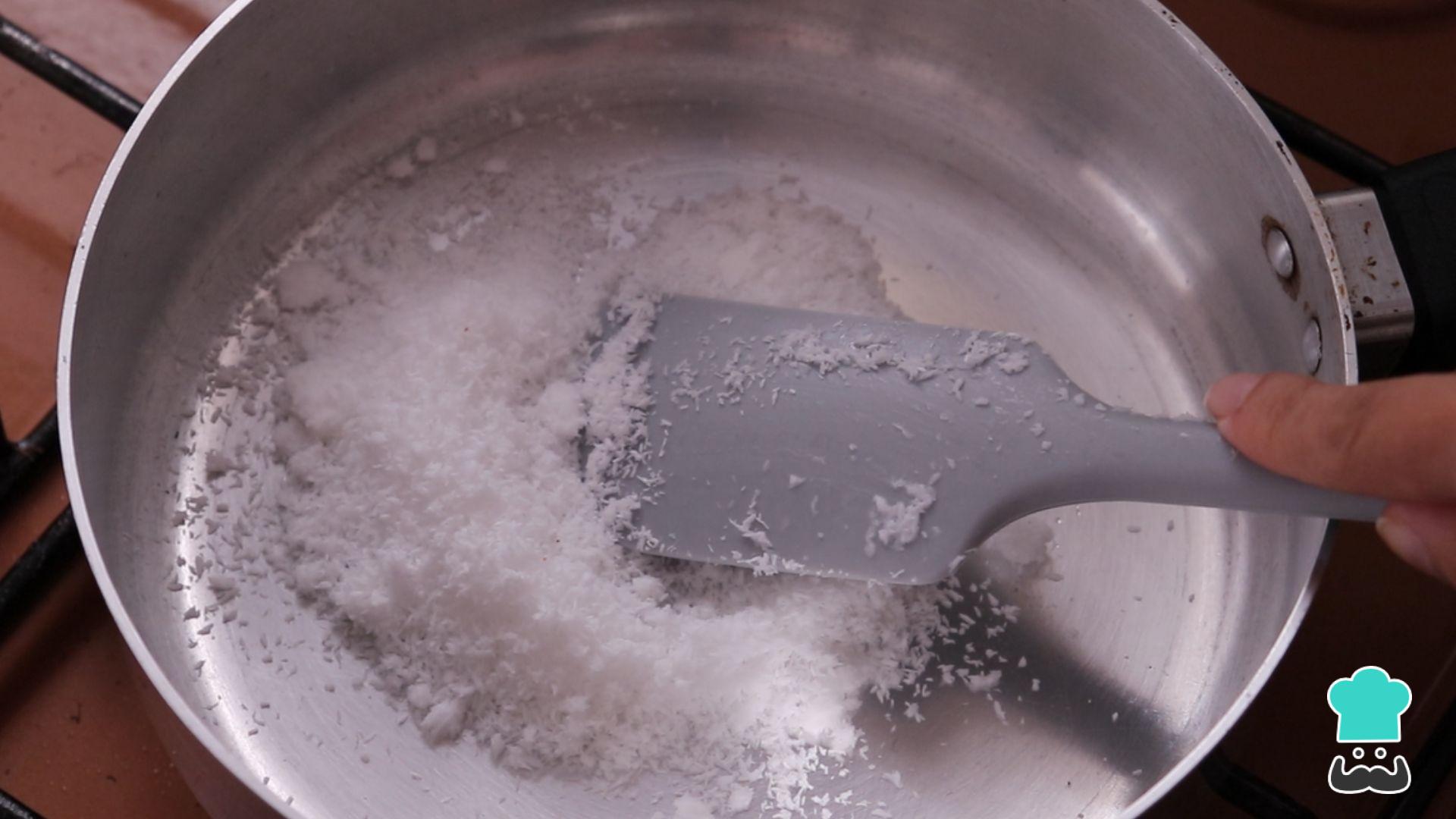 Coloque a polpa que sobrou no pano em uma panela e leve ao fogo baixo mexendo sempre até o coco secar completamente.