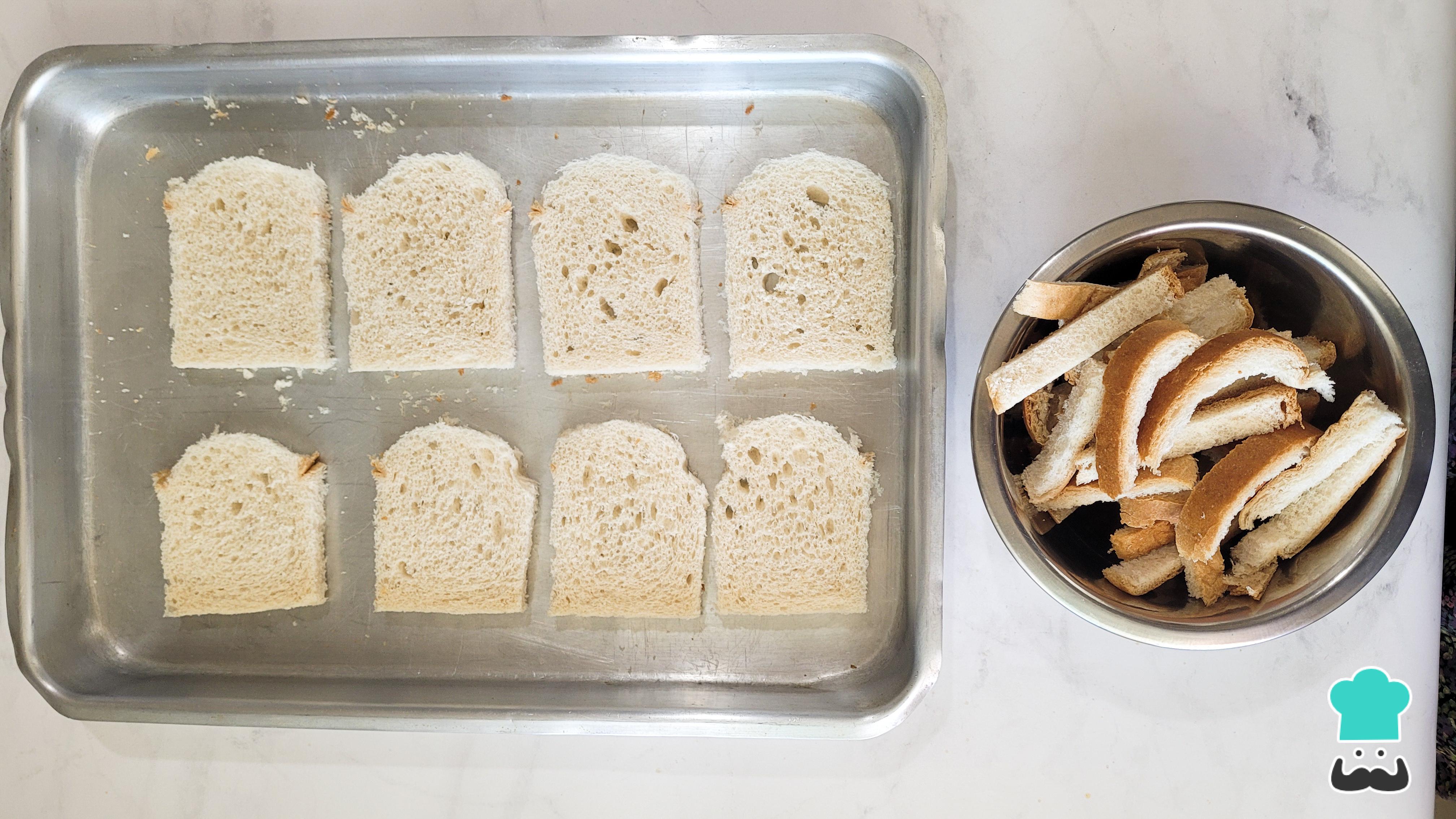 Comece separando as fatias de pão de forma, separe as bordas e coloque em uma forma. Leve para congelar por, pelo menos, 1 hora.
