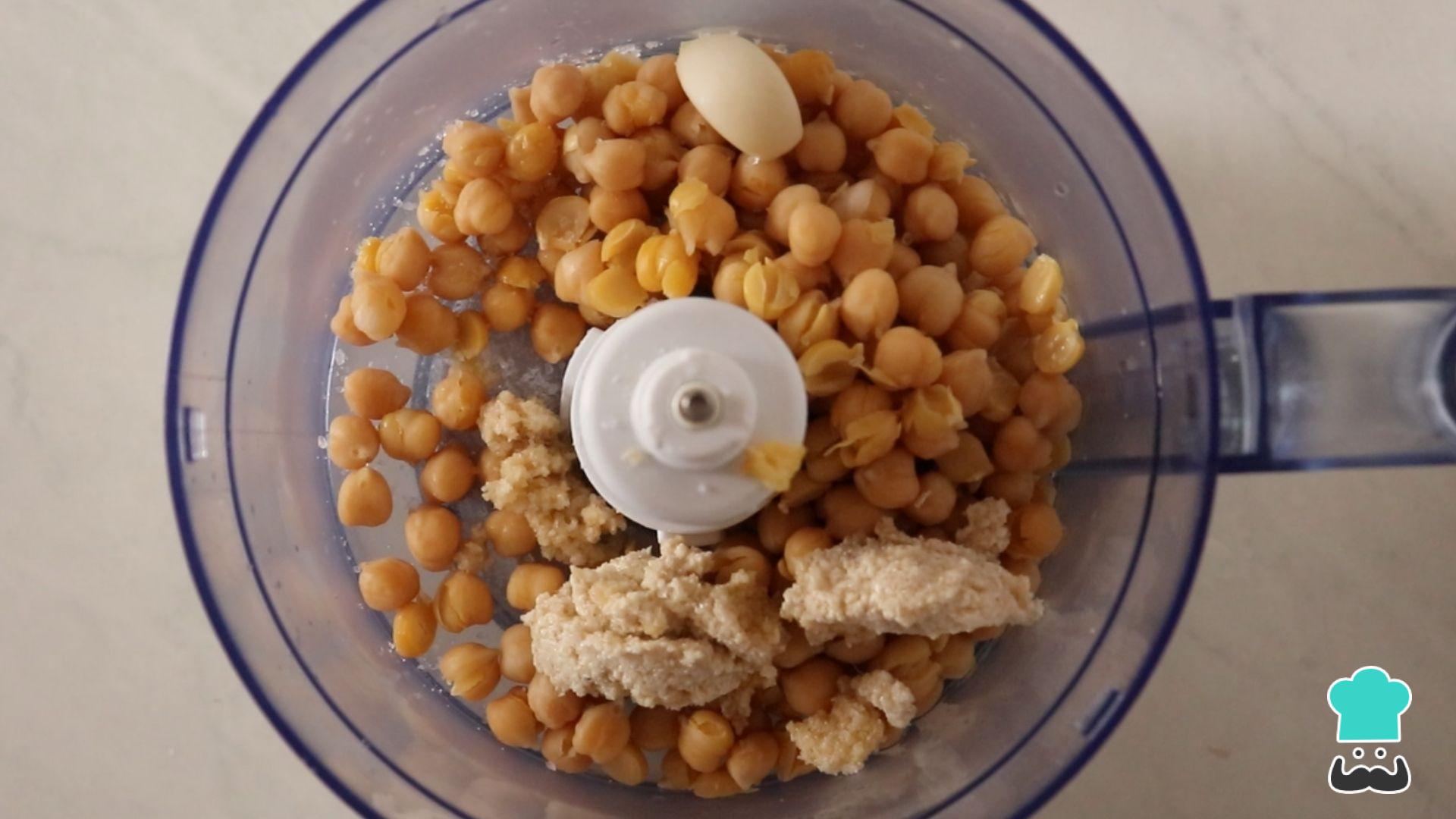 No processador de alimentos, coloque o grão de bico cozido, o alho, o tahine e esprema o limão. Tempere com sal e pimenta-do-reino a gosto e bata bem.