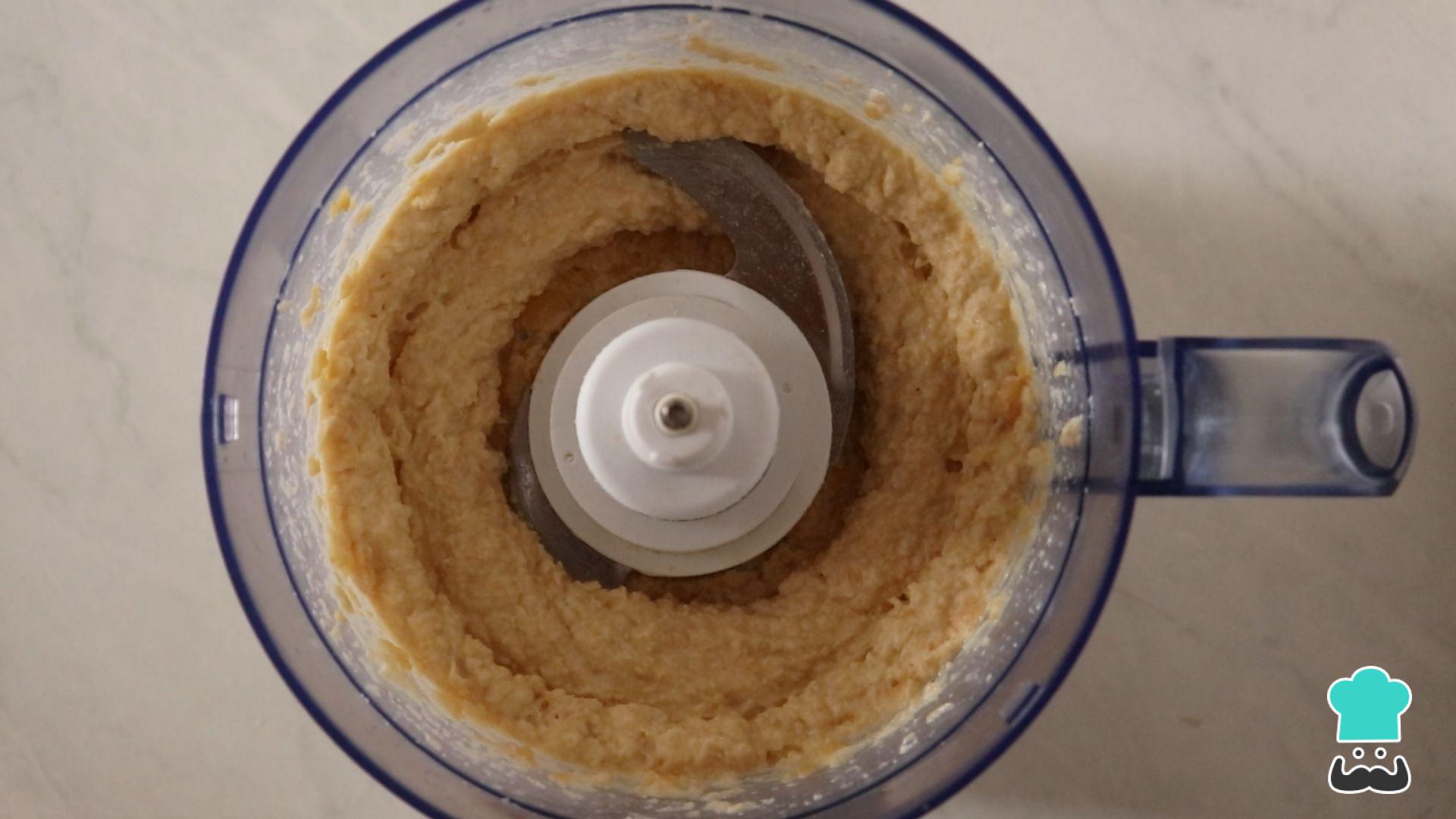 Adicione a água do cozimento aos poucos e bata novamente até obter uma pasta homogênea, como um patê mais grosso.