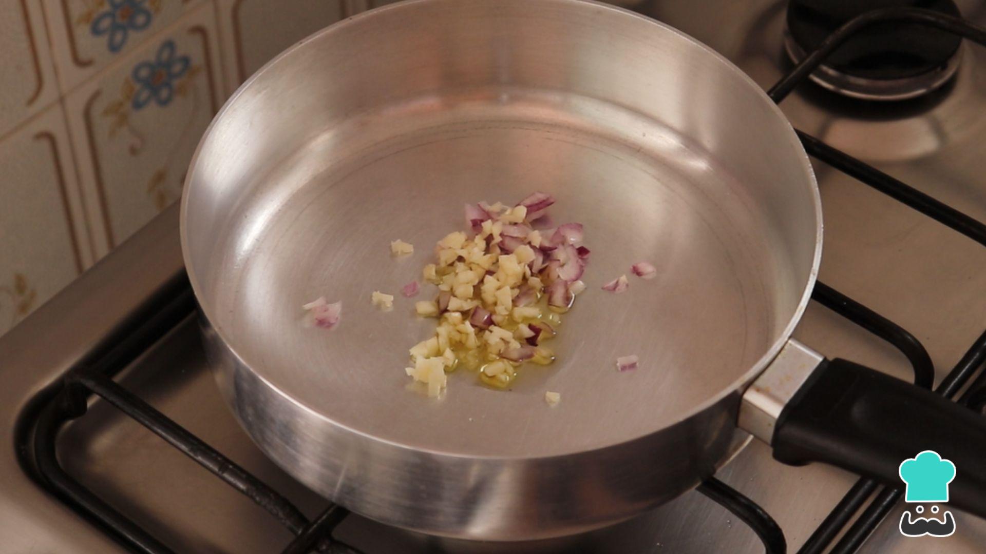 Leve uma panela ao fogo médio e refogue o alho e a cebola no azeite.