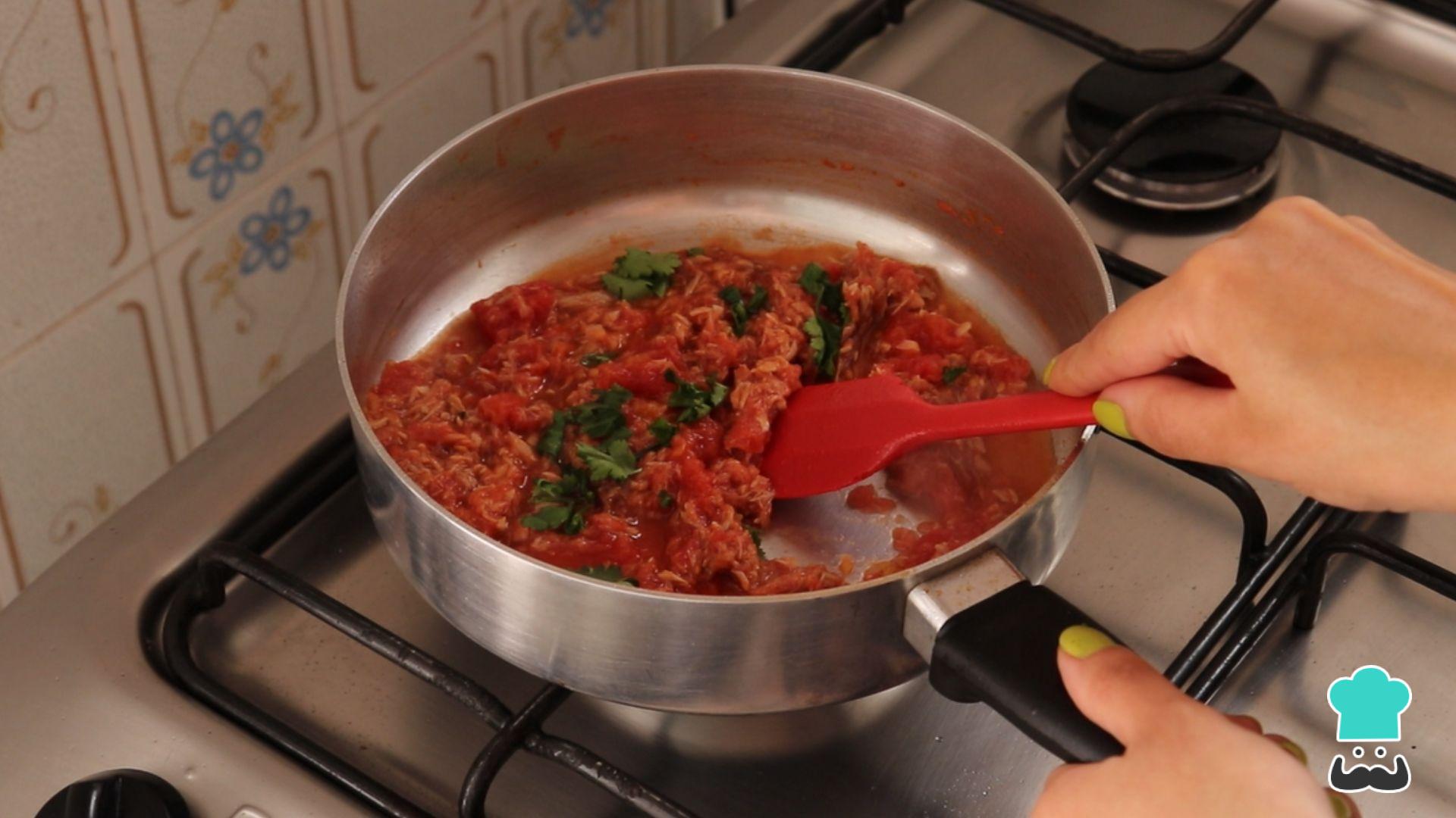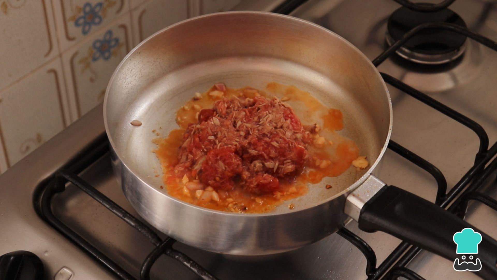 Adicione a sardinha e o molho de tomate. Mexa bem para pegar o sabor do refogado.