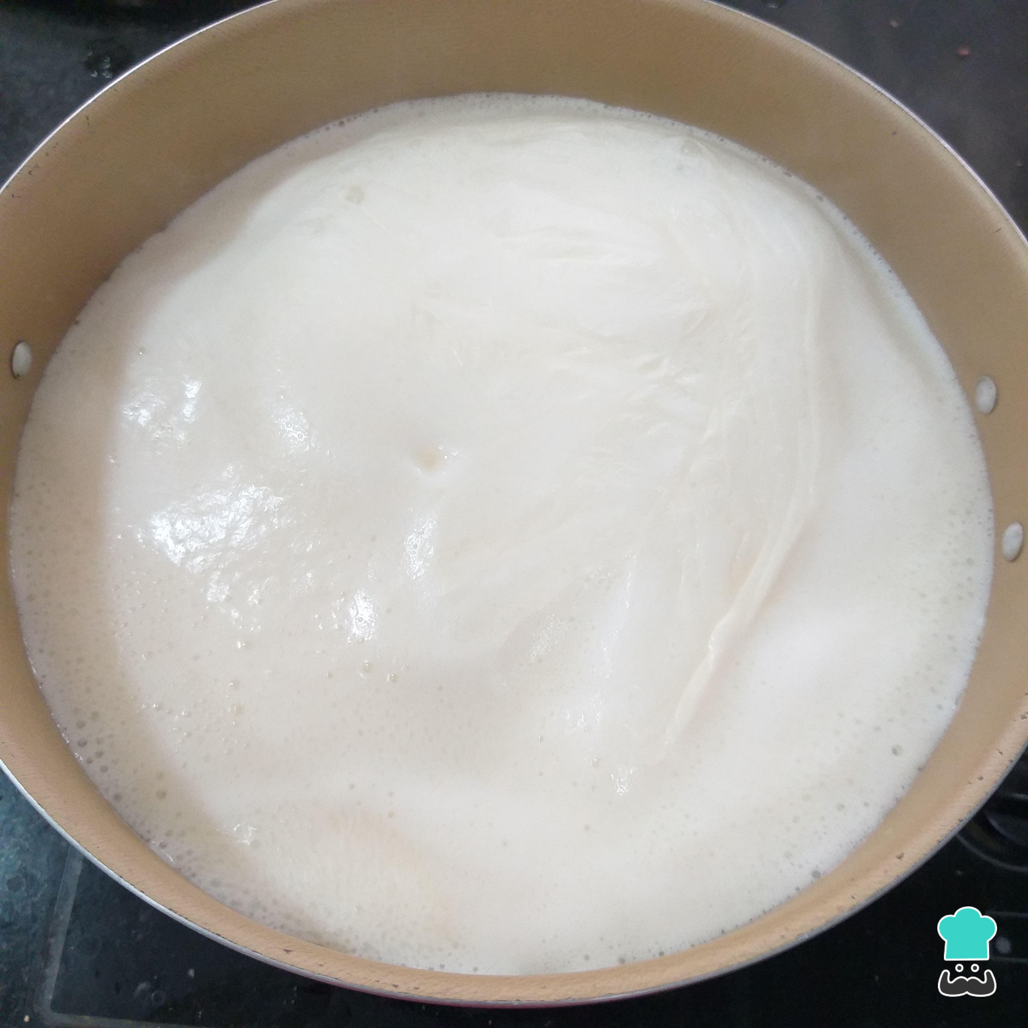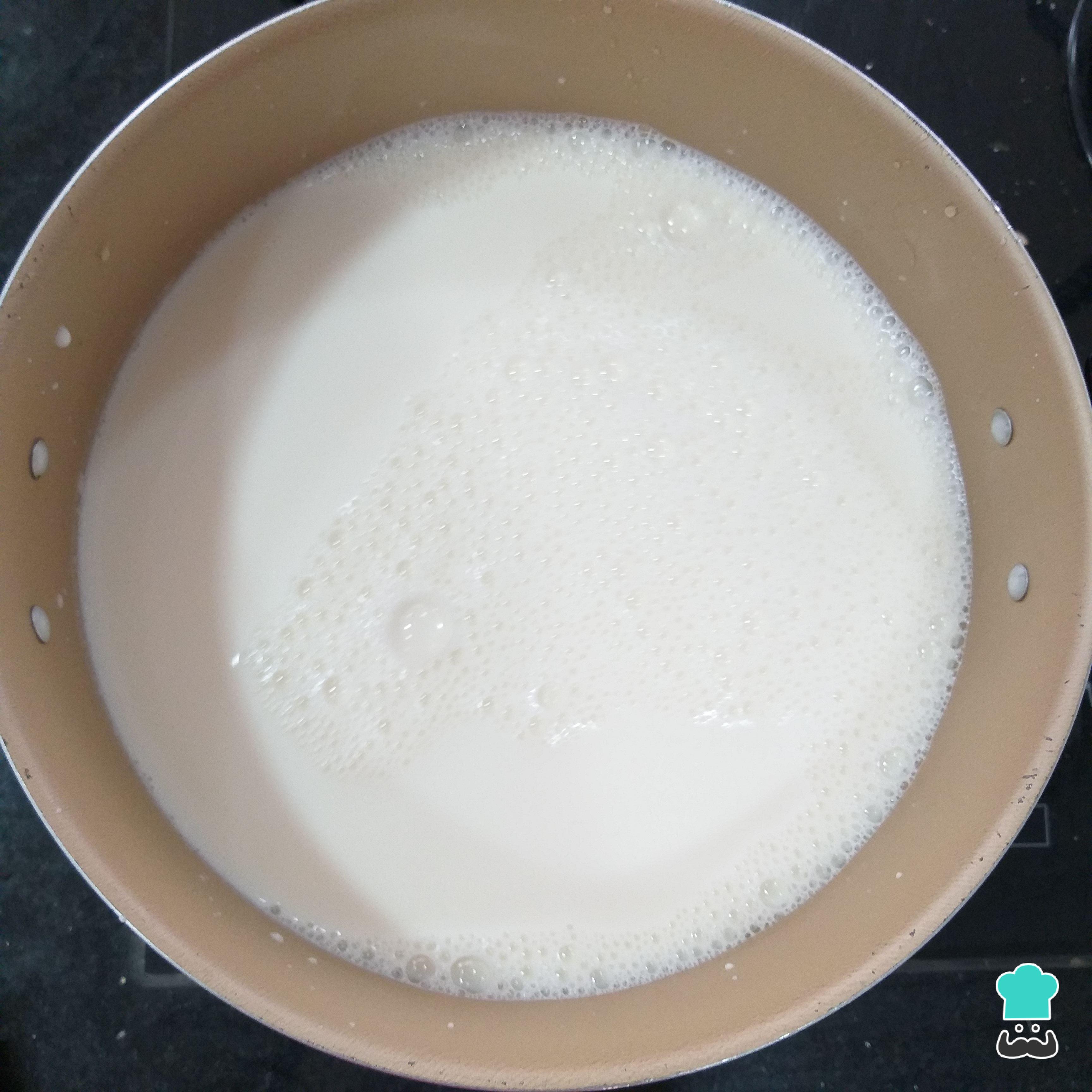 Espere o leite ferver e, nesse momento, desligue o fogo. Depois aguarde o leite esfriar e leve para a geladeira por, no mínimo, 2 horas.