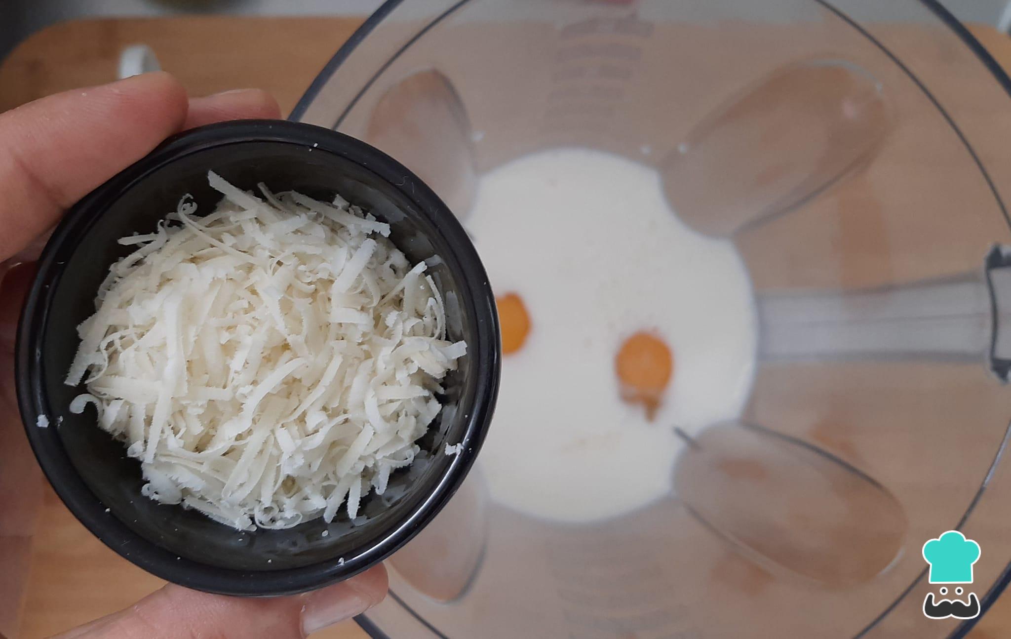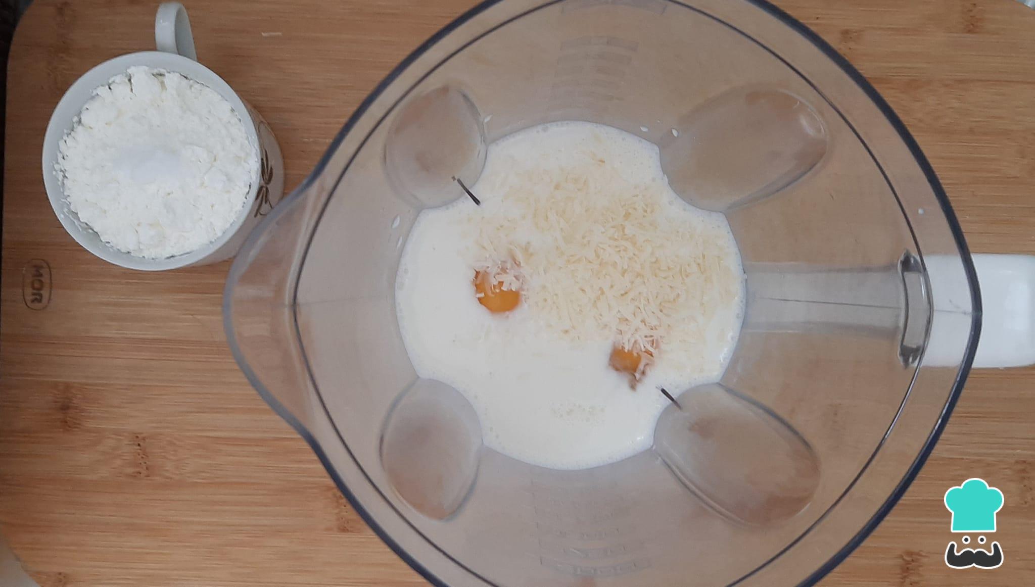 No liquidificador, adicione o leite, os ovos, o sal e o queijo parmesão ralado.