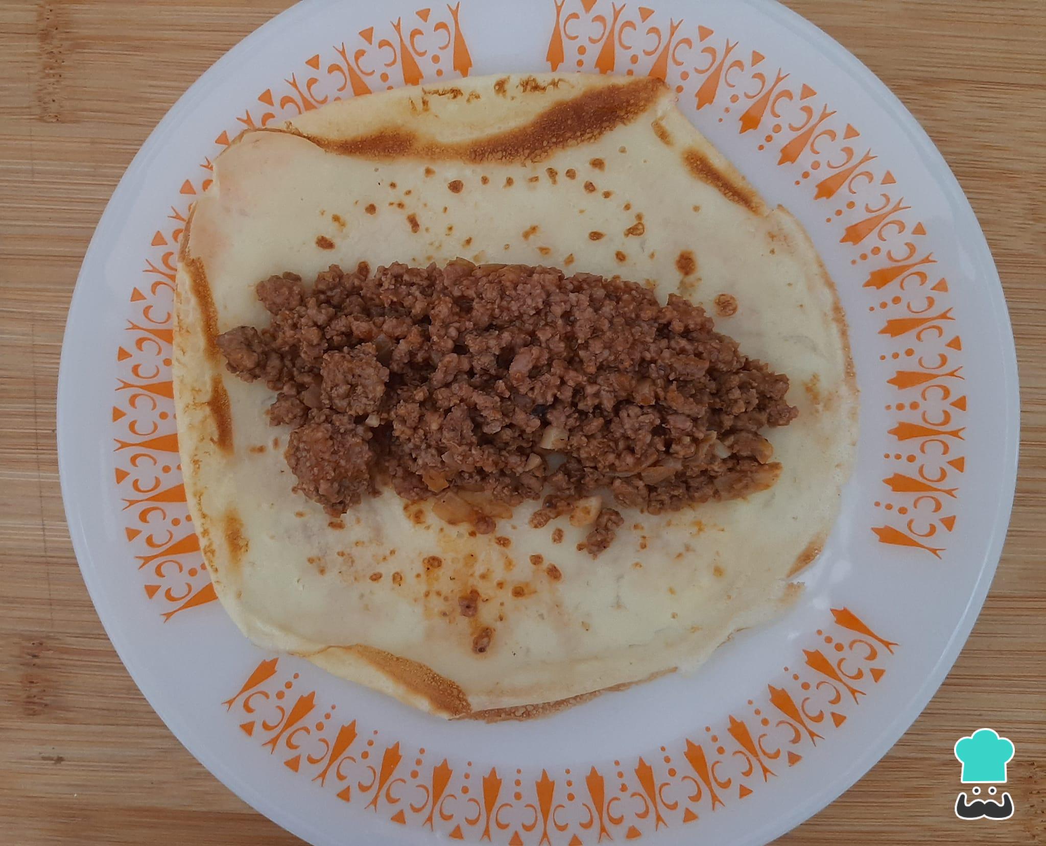 Você poderá rechear a panqueca salgada com o recheio de sua preferência, colocando-o no centro como mostra a foto.