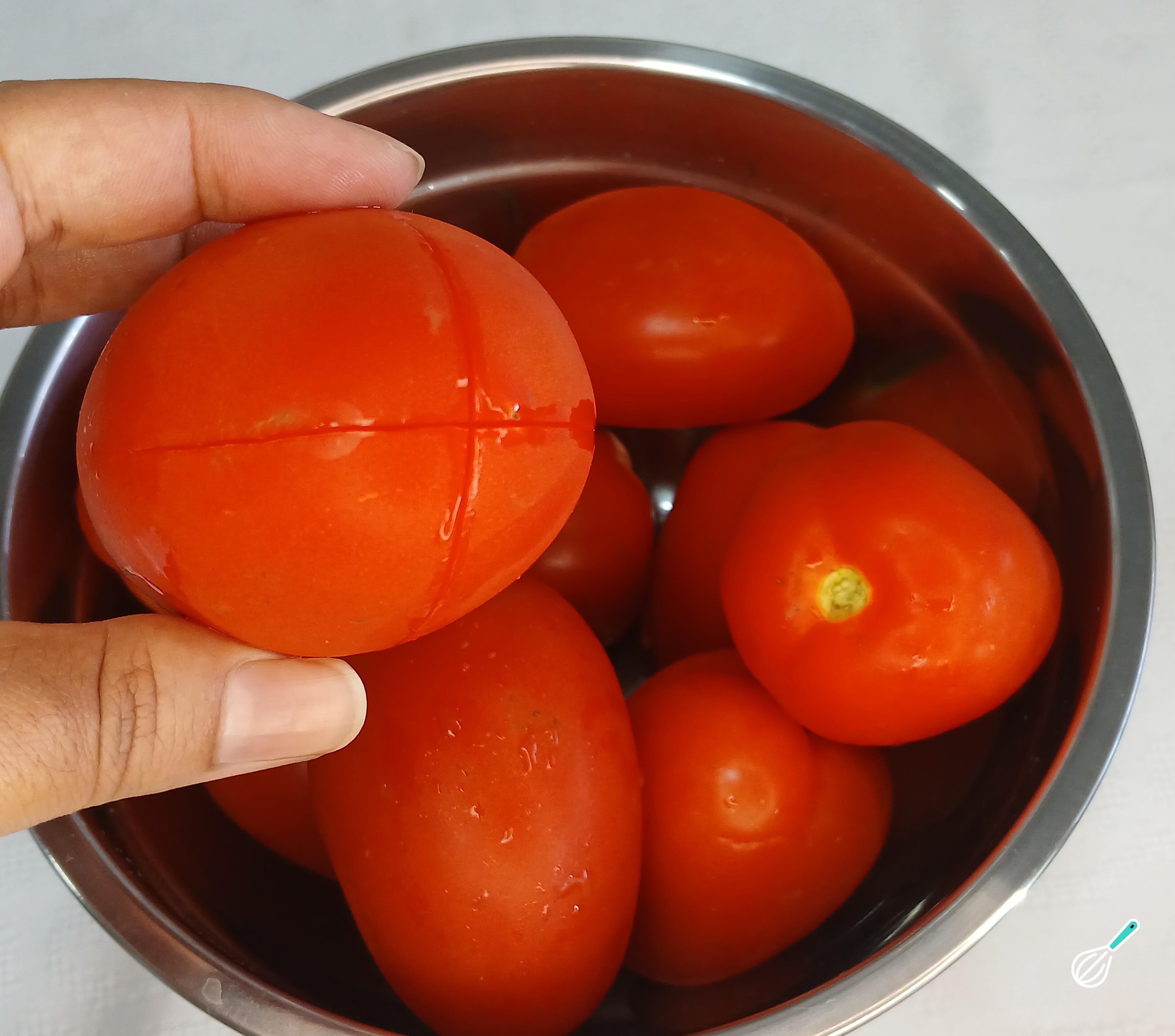 Feito isso, lave bem os tomates em água corrente. Faça um corte em X na parte inferior dos tomates. Esse corte é necessário para que a pele saia com facilidade depois de cozinhar os tomates.