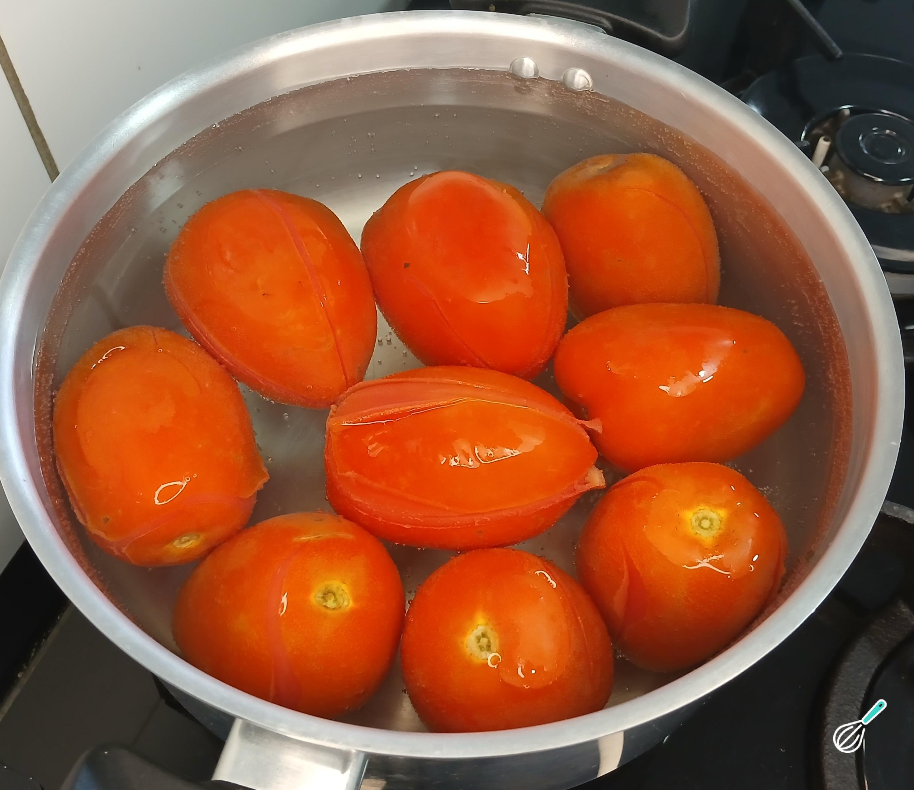 Depois disso, em uma panela grande coloque água e leve ao fogo para ferver. Assim que a água começar a ferver, coloque os tomates para cozinharem. Deixe que cozinhem até que a pele comece a se soltar. Mantenha o fogo de médio para alto.