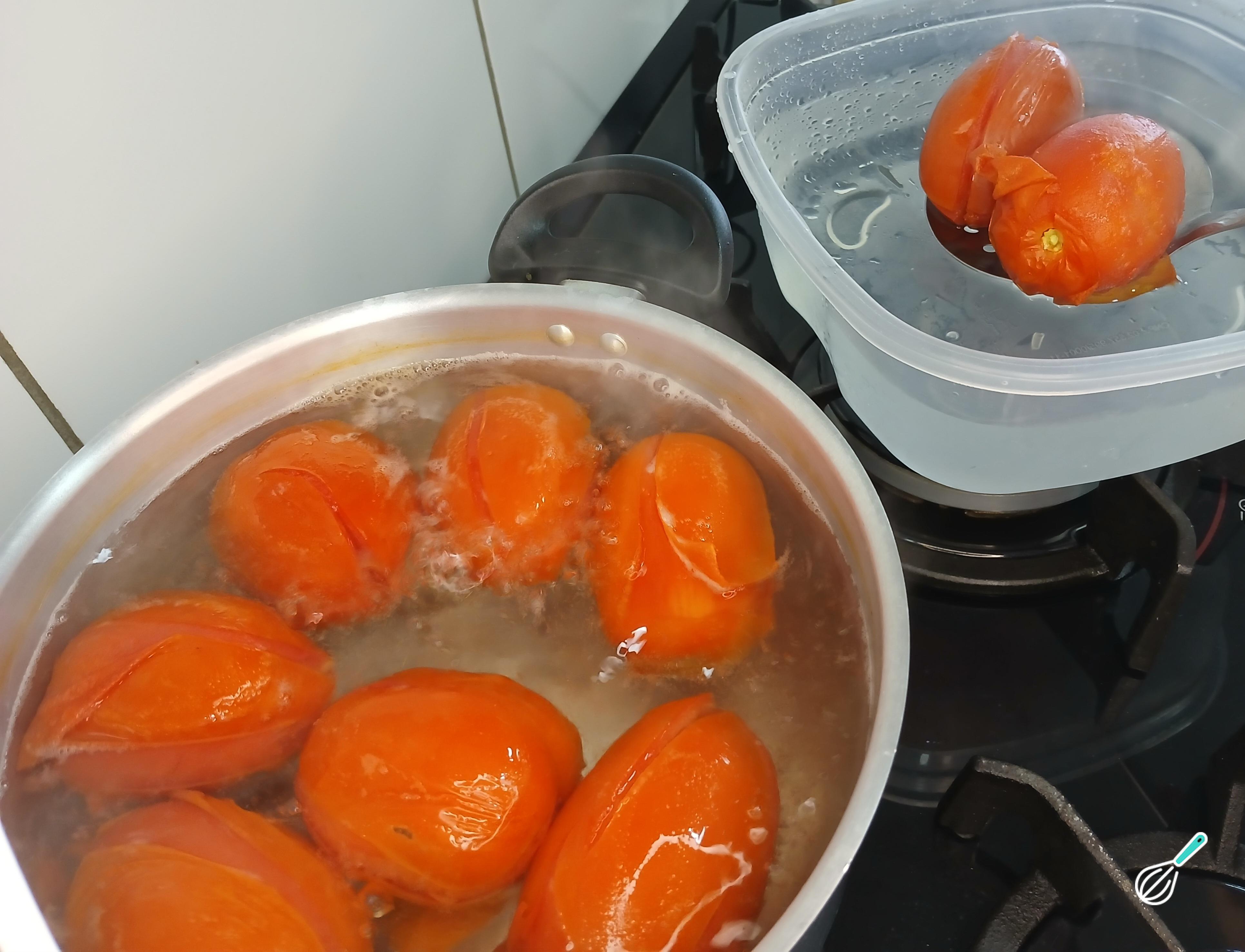 Depois de cozidos, retire os tomates um a um da panela com uma escumadeira e vá colocando em uma vasilha grande com água gelada e gelo. Esse choque térmico vai ajudar a soltar a pele dos tomates com mais facilidade. Retire a pele dos tomates e retire também as sementes.