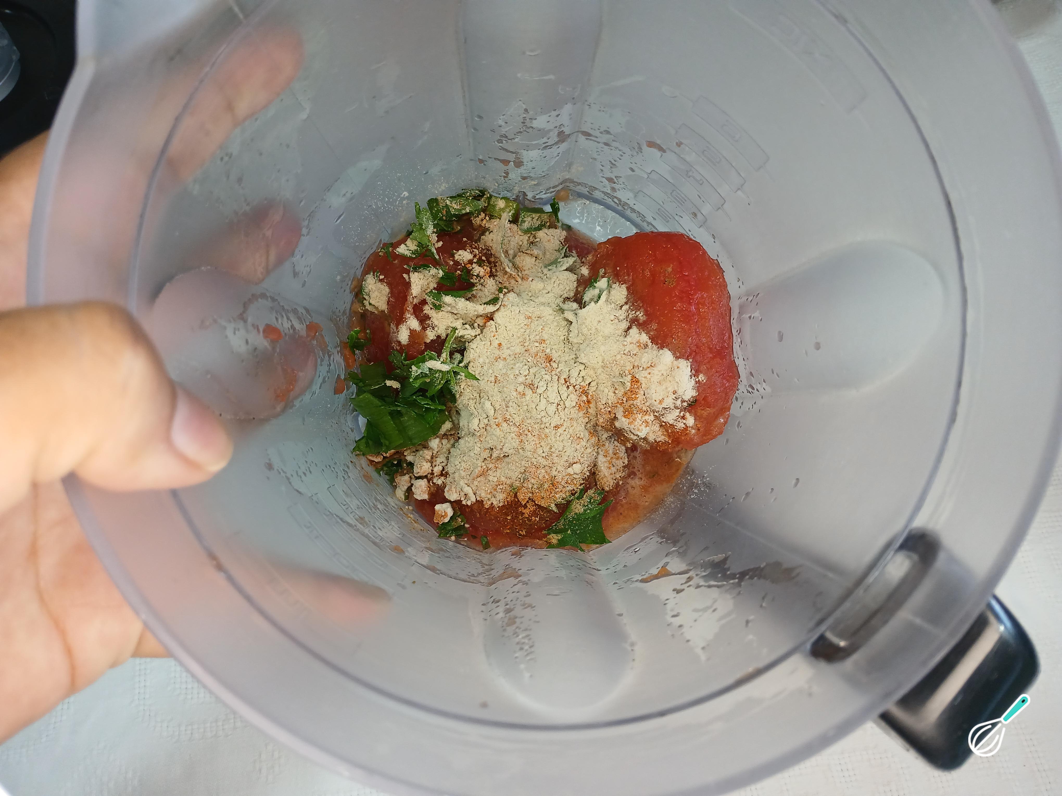 Em um liquidificador, coloque os tomates já sem pele e sementes, coloque os temperos e a cebolinha e salsinha picadas. Não acrescente água. O ideal é ir adicionando os tomates aos poucos e batendo no liquidificador. Se preferir uma passata com pedaços de tomate, use o pulsar.