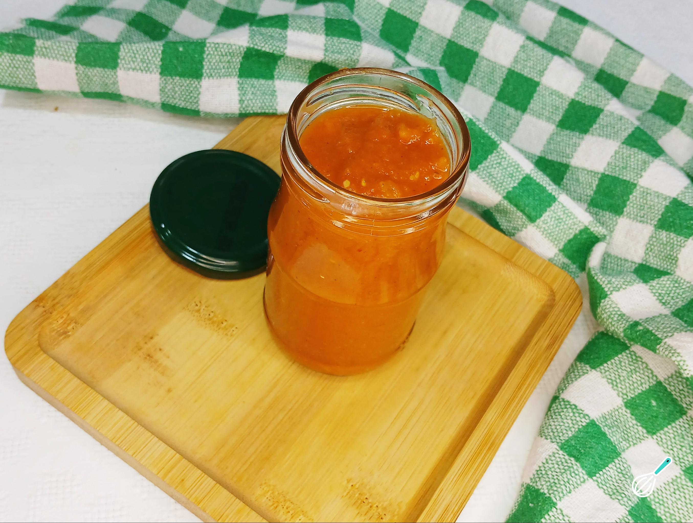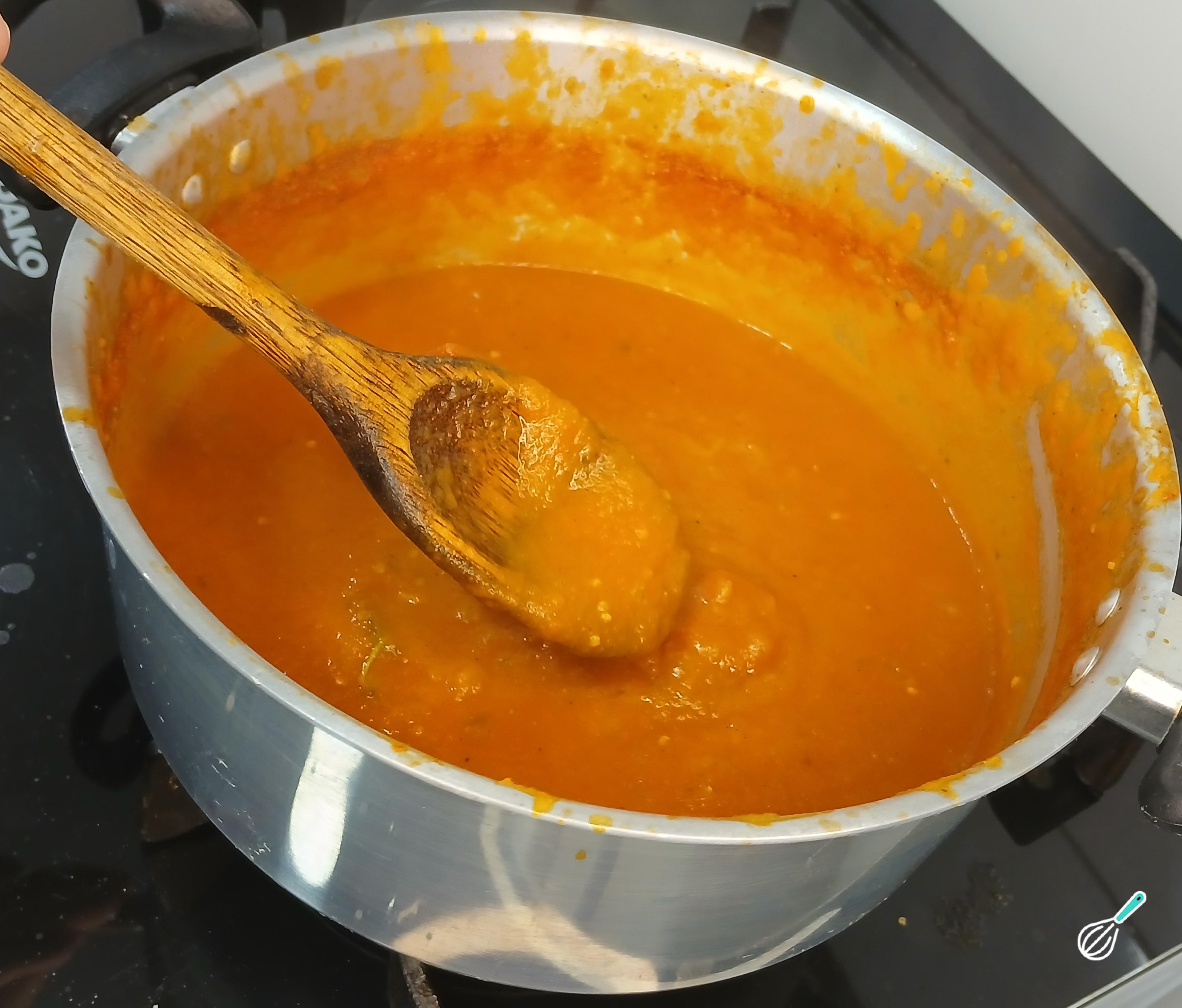 Em uma panela grande, coloque o azeite e a cebola para refogar. Depois de refogada a cebola, transfira o conteúdo do liquidificador para a panela. Acrescente o açúcar, a pimenta e o sal. Mantenha o fogo baixo e deixe cozinhar, mexendo para que não agarre ao fundo.