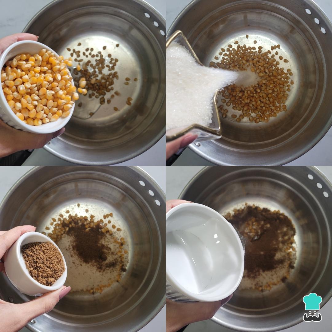 Na panela coloque o óleo, o milho, os açúcares e a água.
