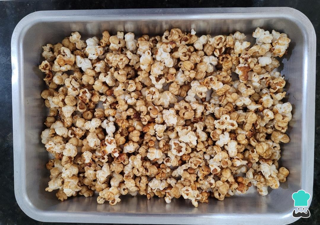 Em seguida, com a pipoca ainda quente, coloque em um tabuleiro, espalhando bem para que esfriem.