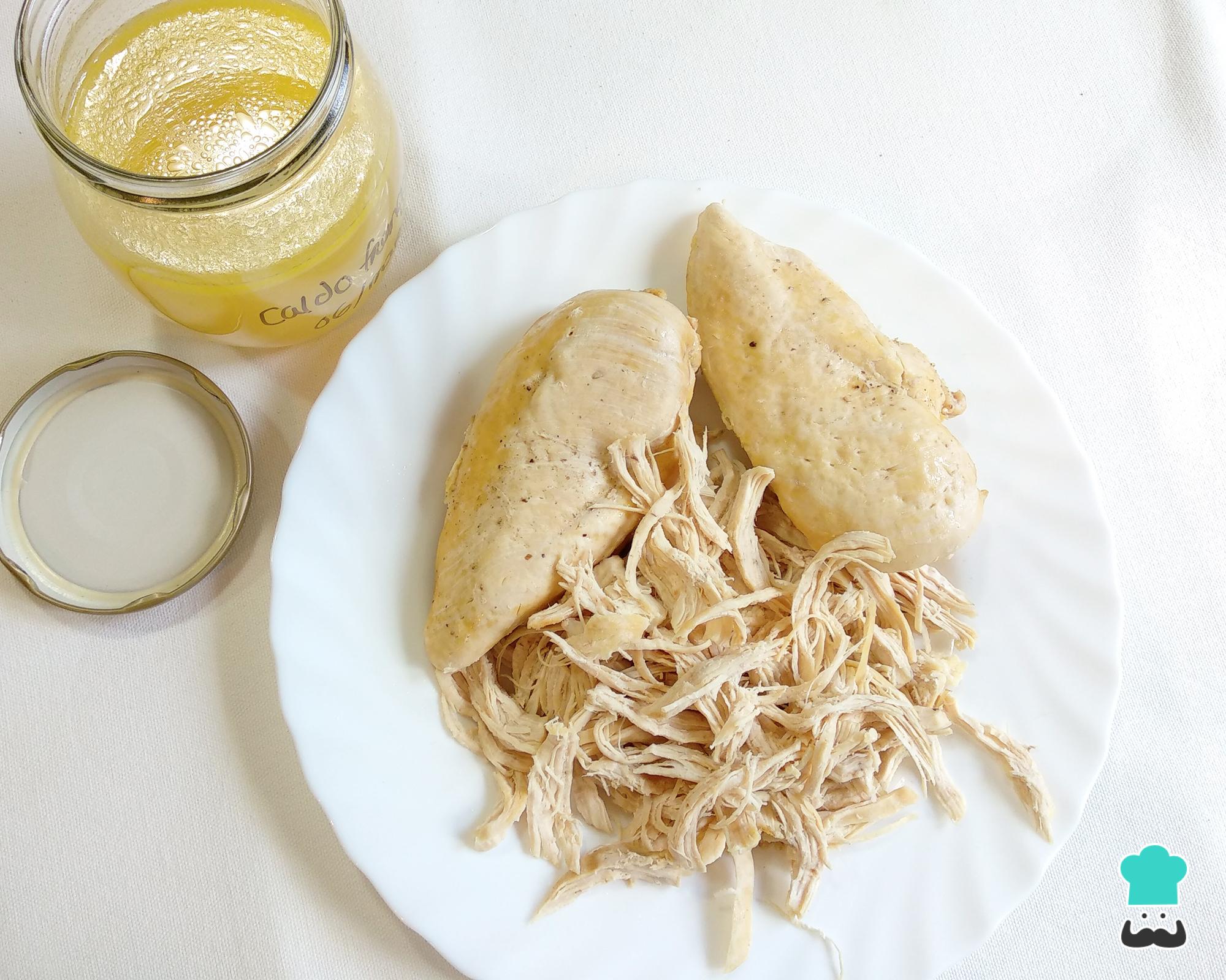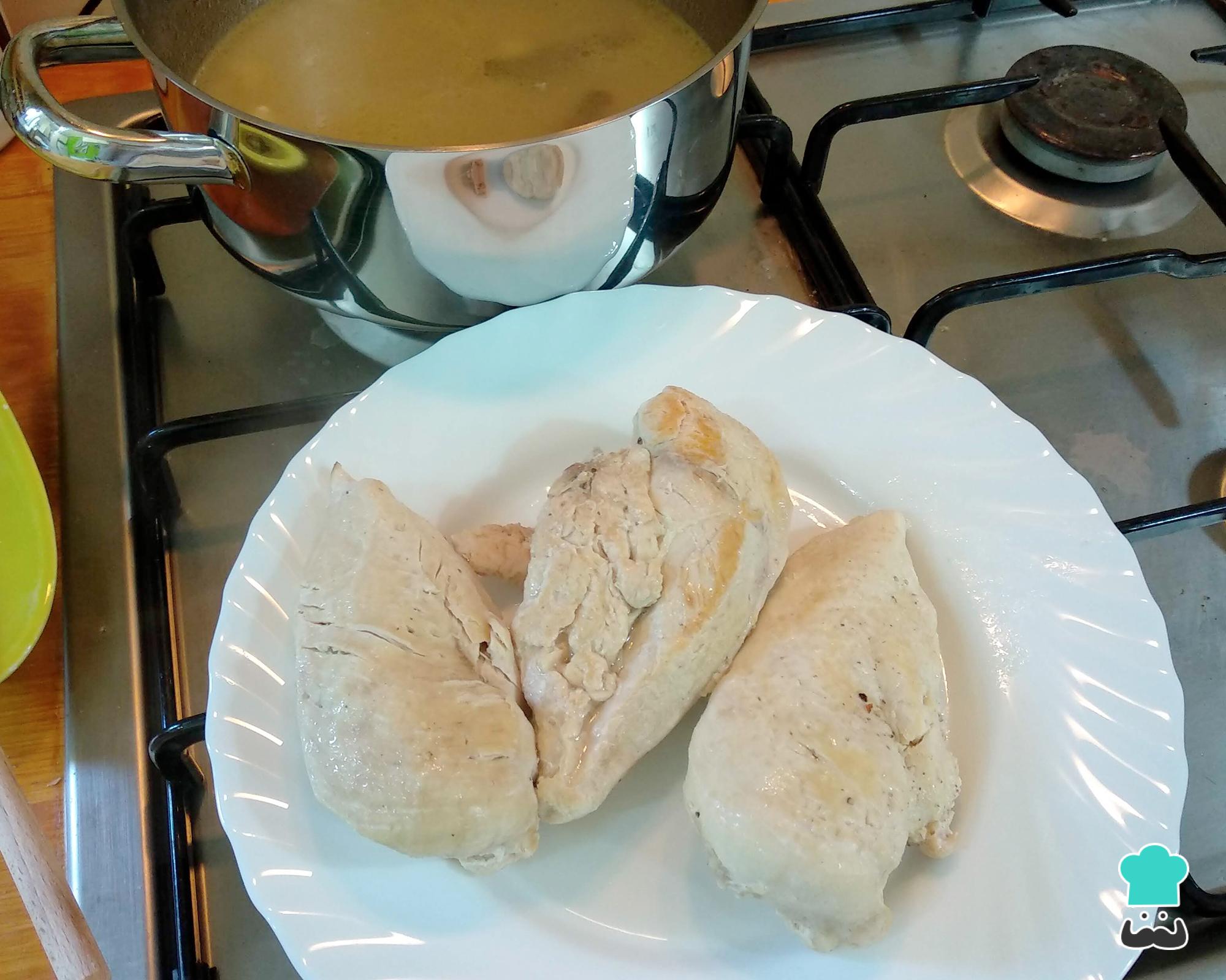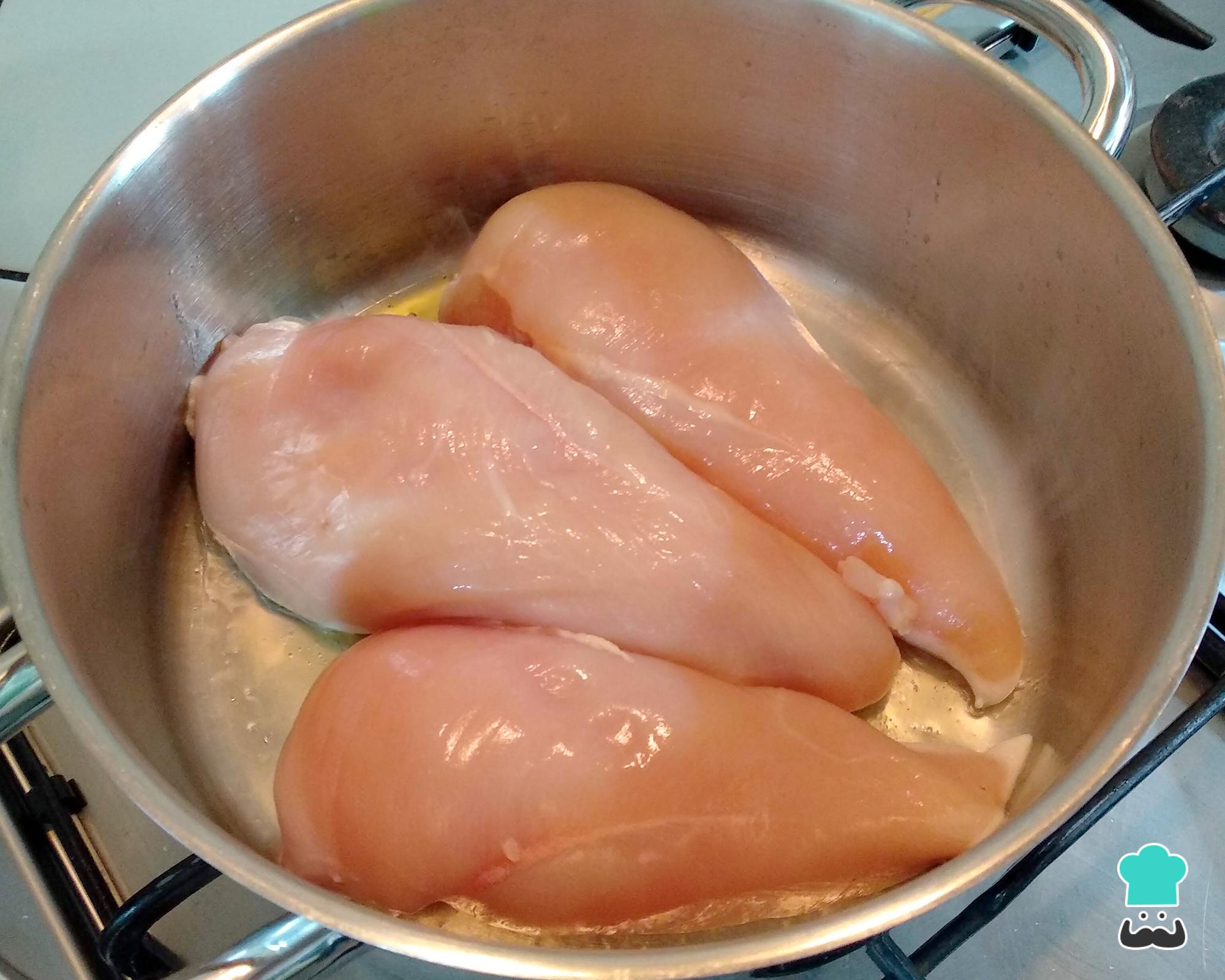 Como deixar o frango cozido macio? Sele ele, ou seja, cozinhe os peitos de frango até mudarem de cor, depois vire para cozinhar do outro lado também, até dourar. Tempere sal e pimenta a gosto.