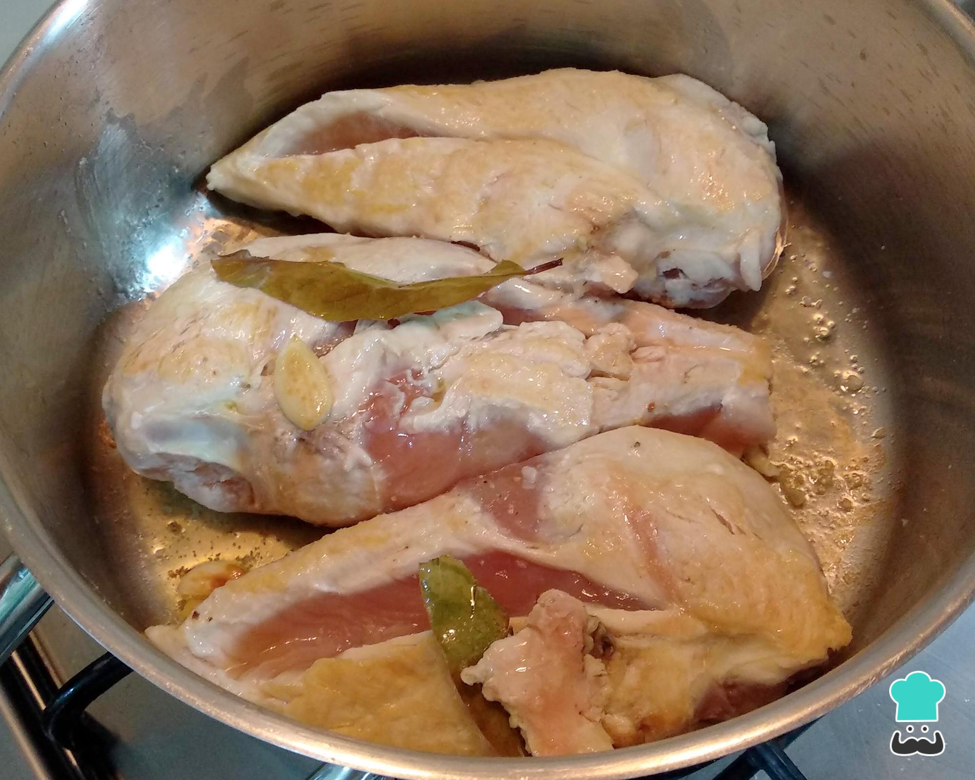 Para terminar de cozinhar o frango cubra-o com água quente ou fervente e deixe até ficar pronto. Como saber se o frango está cozido? No caso do peito de frango, conte 20-30 minutos para a panela comum e 10 minutos para a panela de pressão.