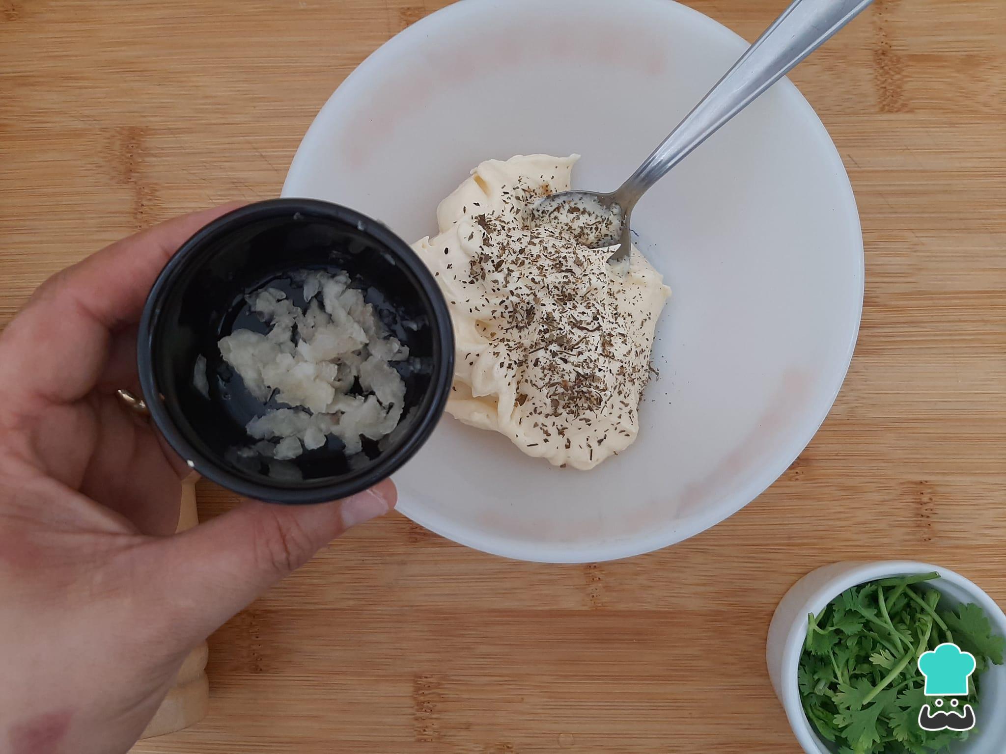 Num bowl, adicione a maionese e tempere com o alho amassado, o sal, a pimenta-do-reino e as ervas finas, misturando bem.