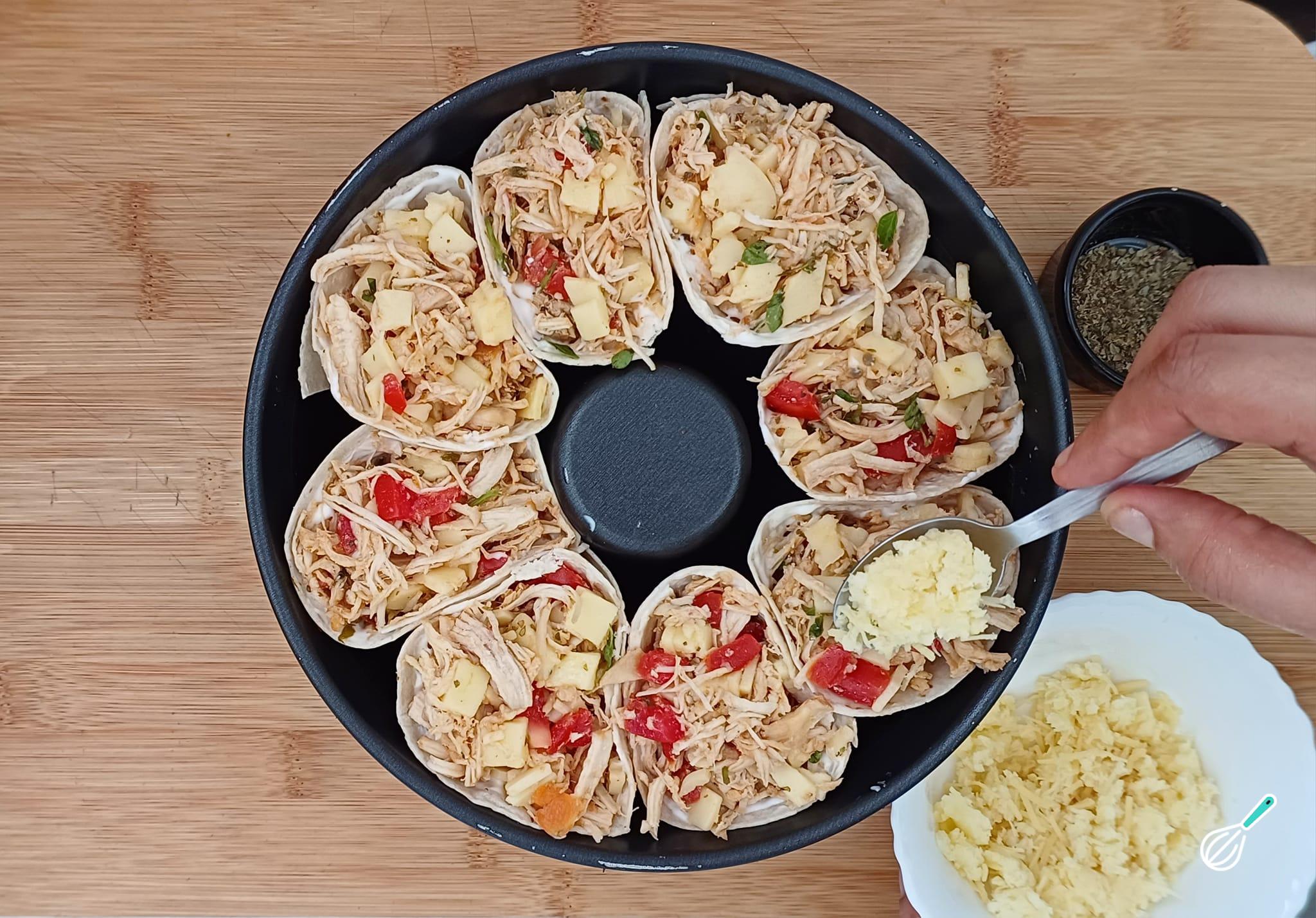 Acomode os cones numa forma redonda com furo central e por cima decore-os com queijo parmesão ralado e mais orégano.