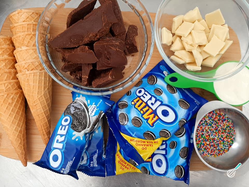 Comece separando os ingredientes necessários para preparar os cones (com cobertura de chocolate) e o primeiro recheio sugerido (chocolate branco com Oreo).
