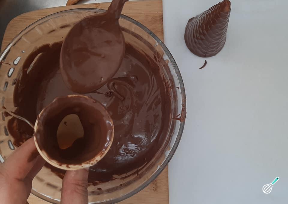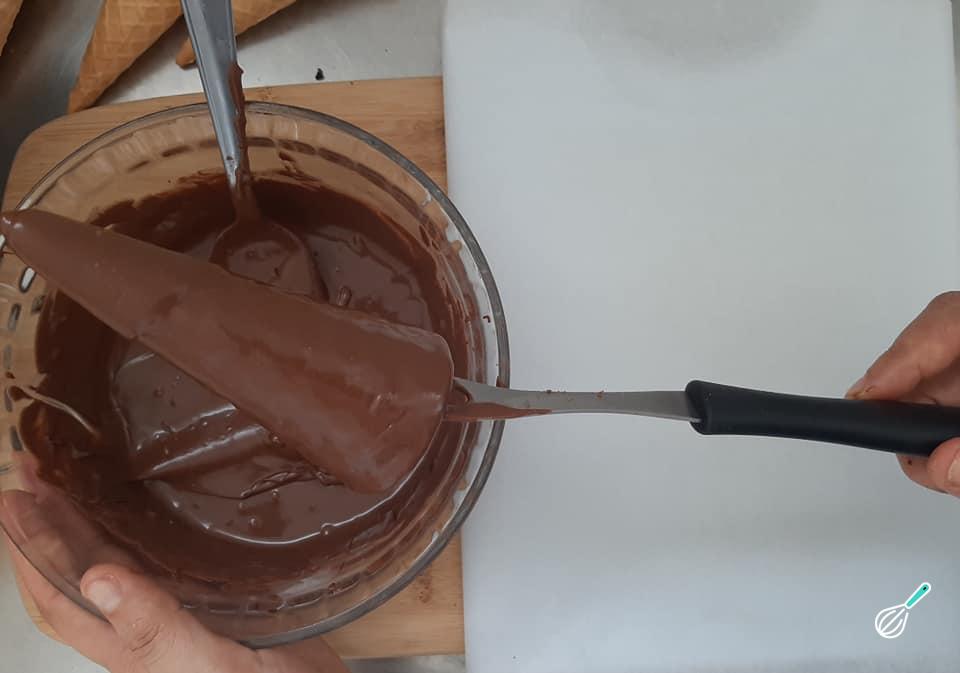Com o auxilio de um garfo longo, banhe toda a parte externa da casquinha e em seguida, dê leves batidas dentro do recipiente para retirar o excesso de chocolate.