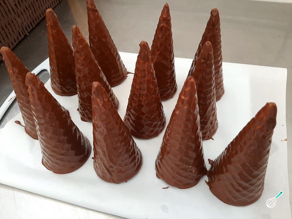 Dica: Separe uma folha de papel manteiga para acomodar os cones banhados de chocolate.