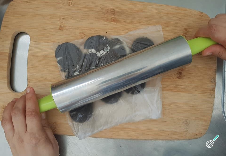 Prepare o primeiro recheio para cone trufado de Oreo, triturando grosseiramente os biscoitos Oreo dentro de um saco, como na foto.