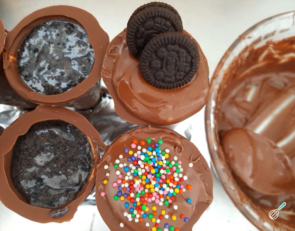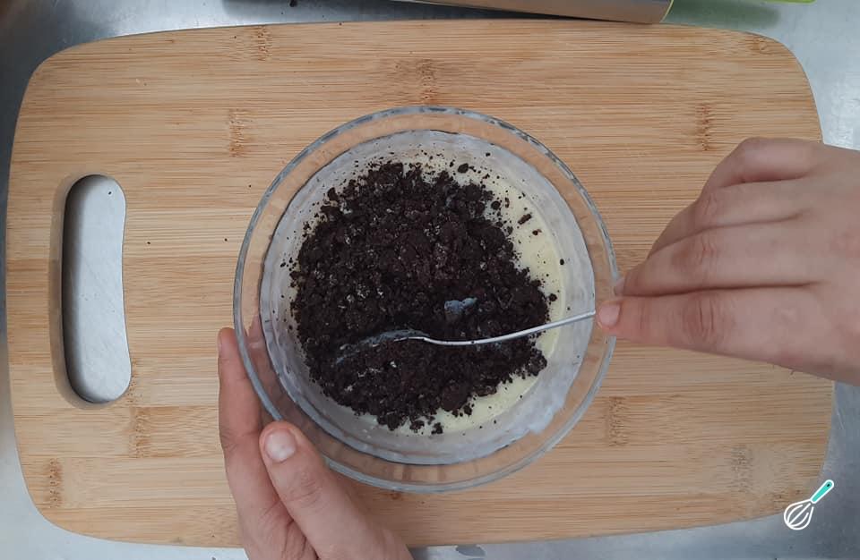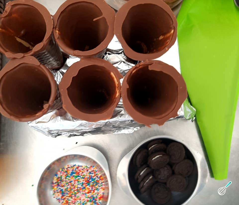 Em seguida, junte 100 gramas de chocolate meio amargo e 8 biscoitos Oreo triturados (grosseiramente). Misture tudo até ficar homogêneo. Espere amornar um pouco para preencher os cones.