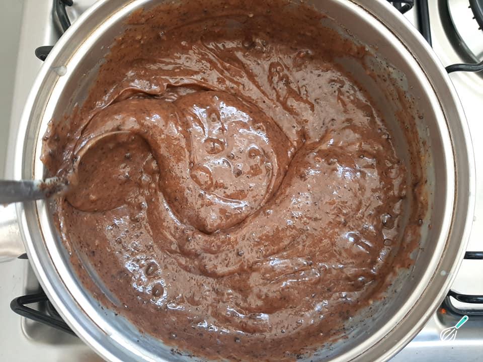 Prepare o brigadeiro de Oreo trufado, levando o leite condensado e a manteiga para cozinhar em fogo baixo, mexendo sempre, até chegar o ponto de brigadeiro, soltando um pouco do fundo da panela. Desligue o fogo.
