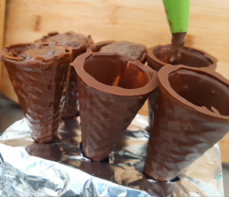 Coloque o recheio de chocolate branco dentro de um saco de confeiteiro ou utilize apenas uma colher para preencher os cones. Depois de preencher os cones, leve-os à geladeira para terminar de montar os demais.