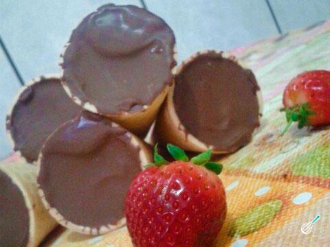 Derreta a barra de chocolate em banho maria e espere ficar morno para usar. Depois use esse chocolate para banhar as casquinhas por dentro (e por fora também caso queira) e espere o chocolate secar - pode levar à geladeira por 5 minutos para acelerar o processo.
