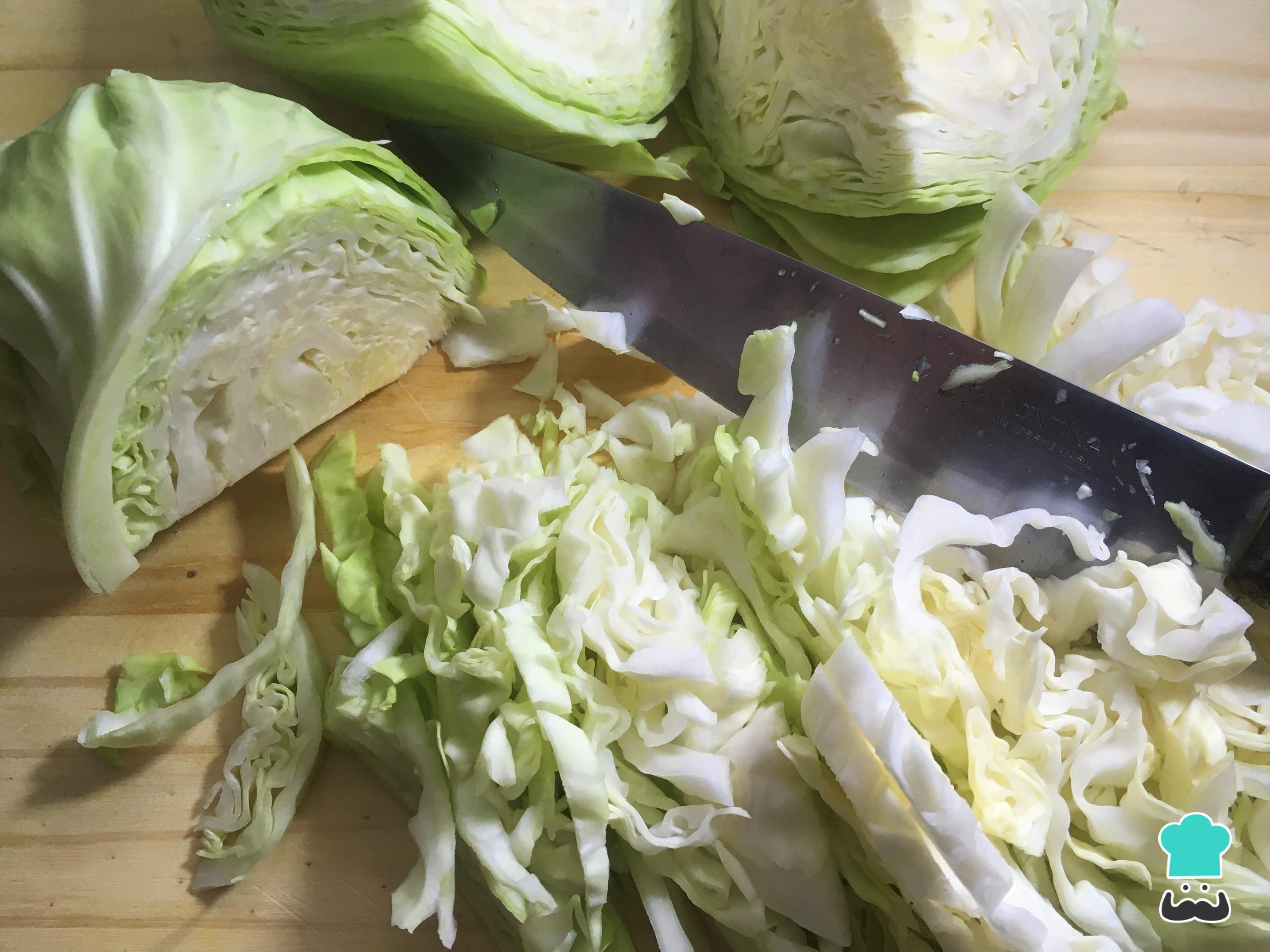 Retire as folhas exteriores do repolho, pois geralmente estão machucadas. Corte o repolho em quatro partes, retire a parte dura do meio e fatie finamente. Depois disso coloque o repolho numa balança para saber quanto de sal é necessário usar: se você tiver 1 kg de repolho, irá necessitar de 20 g de sal grosso. Se o repolho pesar um pouco menos, reduza o sal.