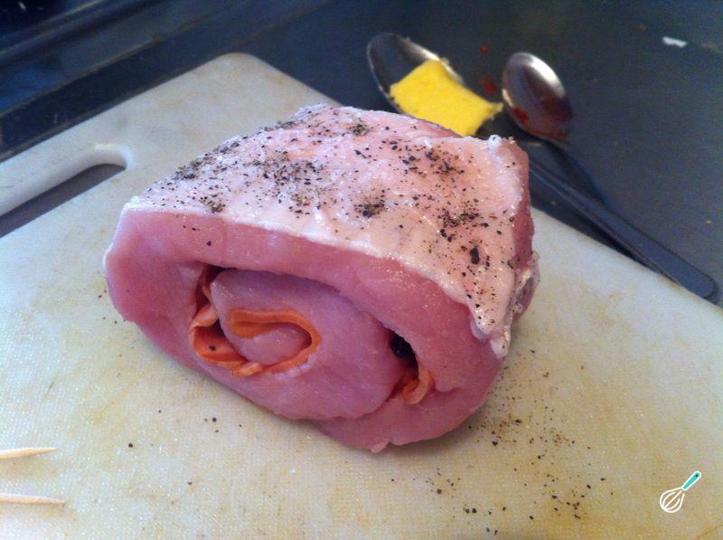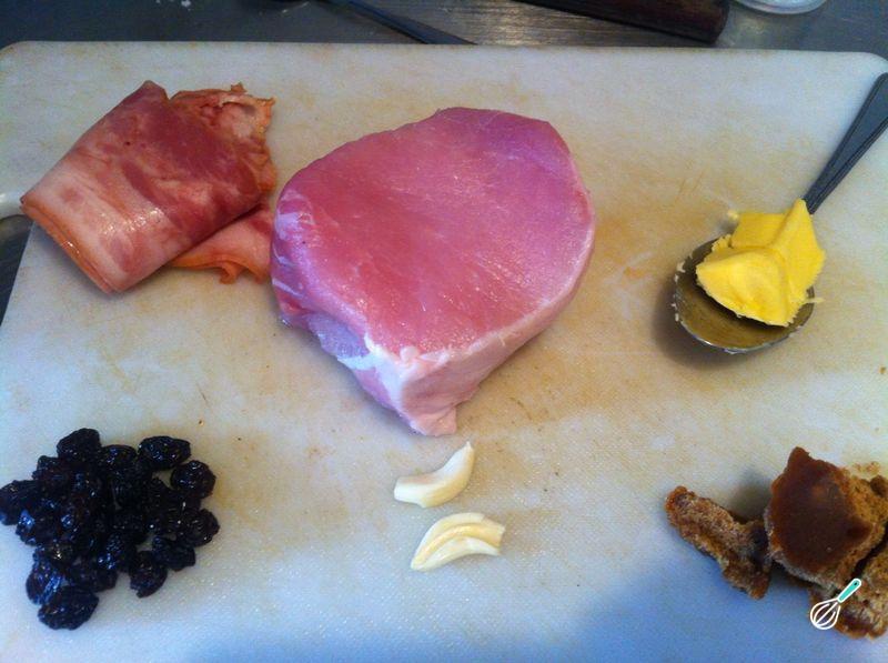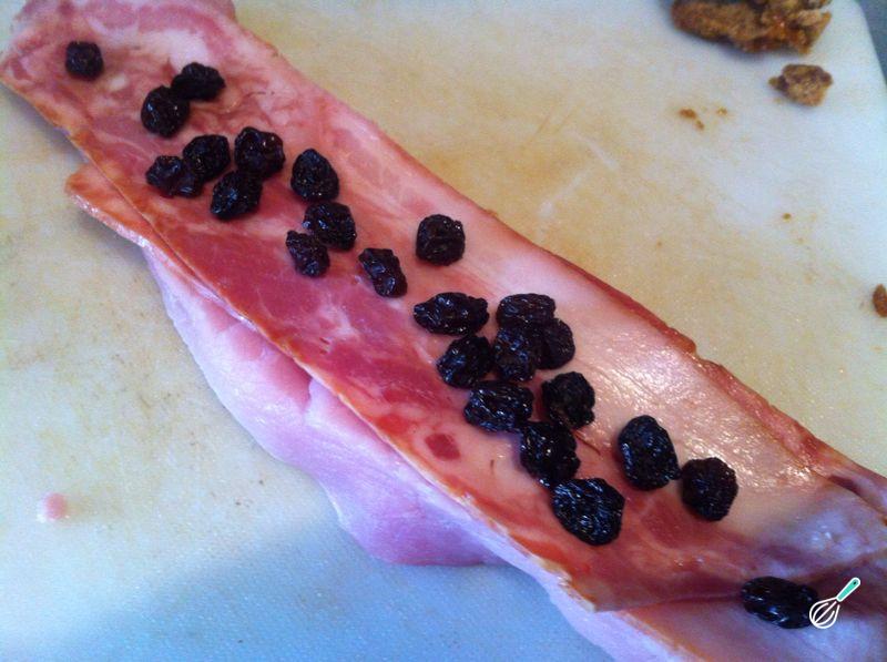 Em seguida abra a carne e tempere por dentro e por fora com sal. Num dos lados coloque as fatias de bacon e disponha as uvas-passas.