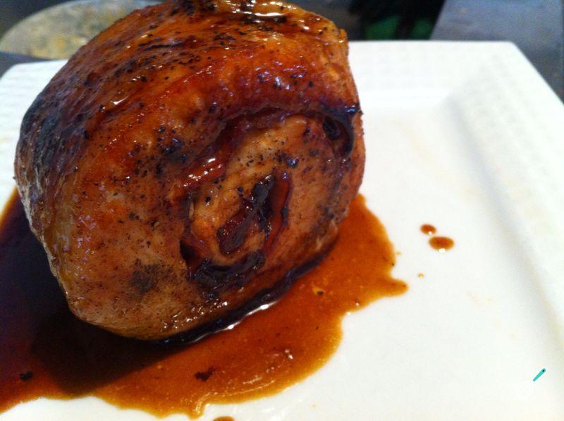 Quando a carne estiver cozinhada, acrescente um pouco de água e o açúcar e deixe derreter. Envolva o contra filé recheado com bacon nesse molho, e sirva em seguida acompanhado de, por exemplo, batata gratinada. Bom apetite!