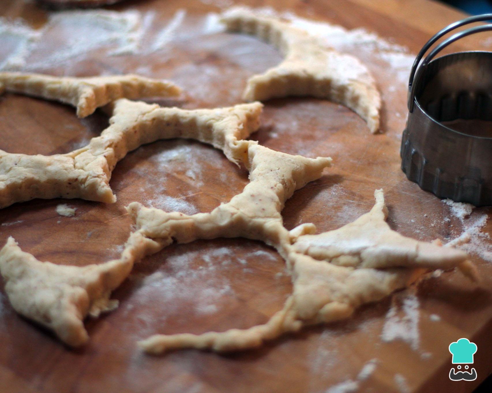 Preaqueça o forno nos 180 graus (forno médio) e abra a massa dos biscoitos sem trigo com a ajuda de um rolo, até ficar mais ou menos com meio dedo de altura (5 mm). Corte usando um cortador ou simplesmente um copo.