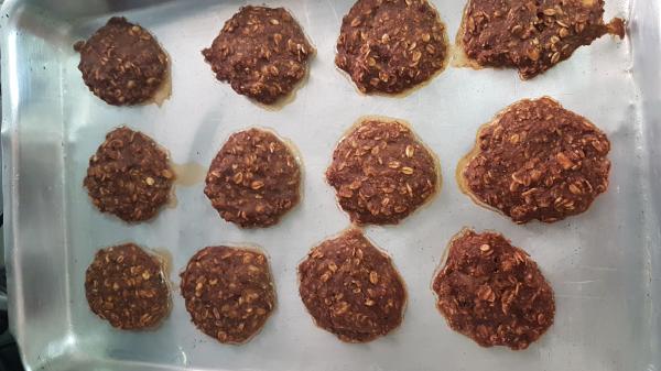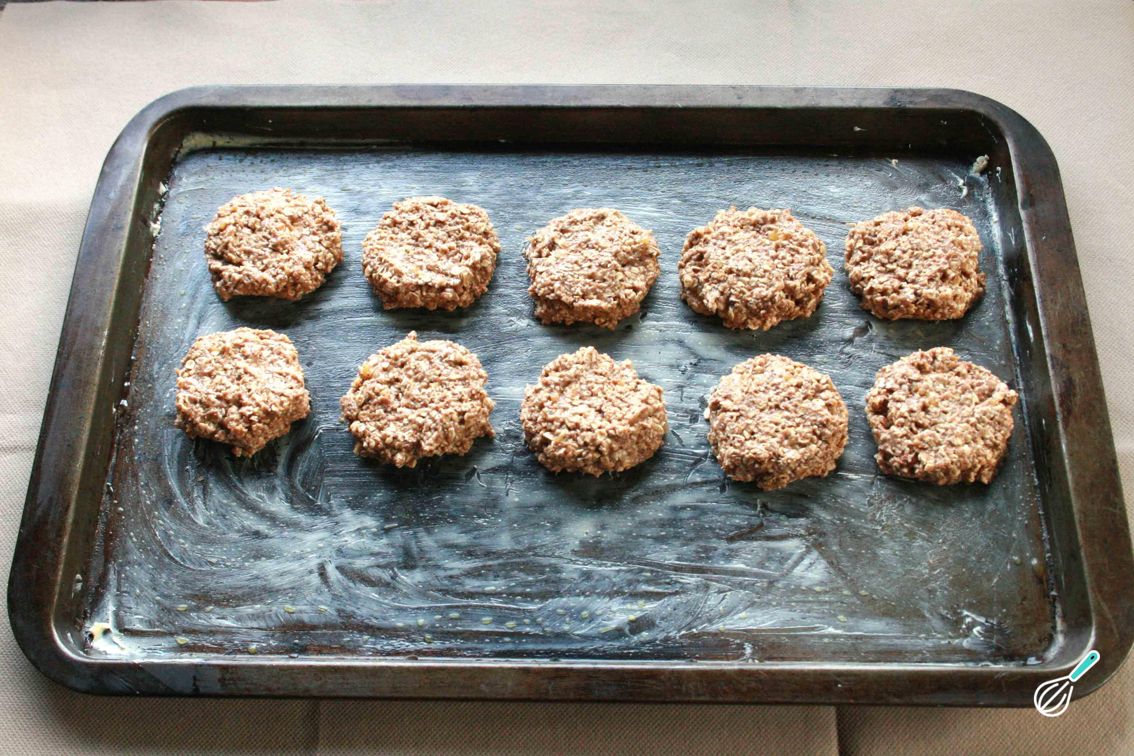 Unte um tabuleiro de forno com manteiga/margarina ou simplesmente forre com papel manteiga. Modele os biscoitos de aveia e banana usando duas colheres ou as mãos e coloque no tabuleiro. Leve a assar no forno a 180ºC por 25 minutos.
