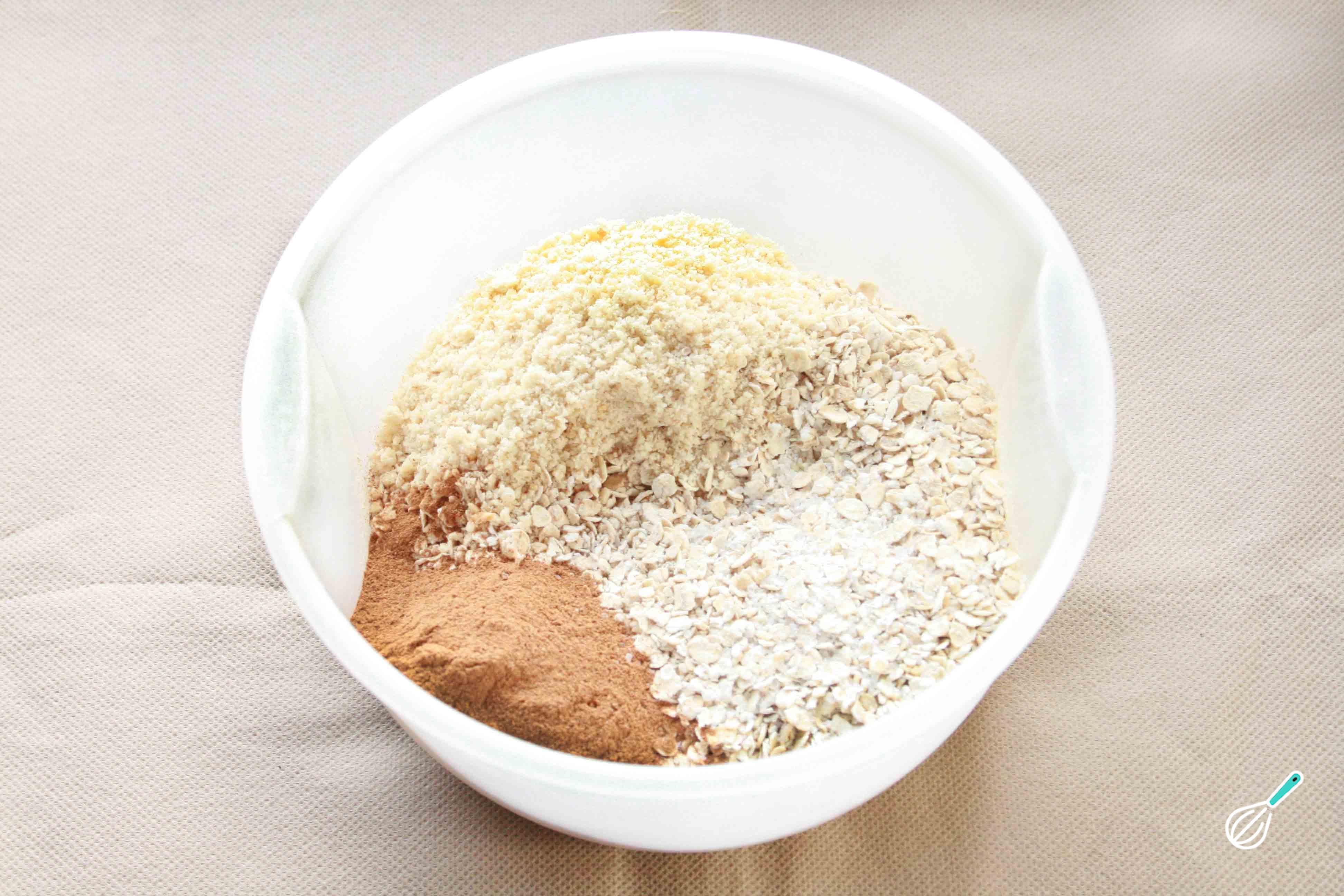 Numa tigela misture os ingredientes secos (a aveia, a amêndoa, a canela e o sal).