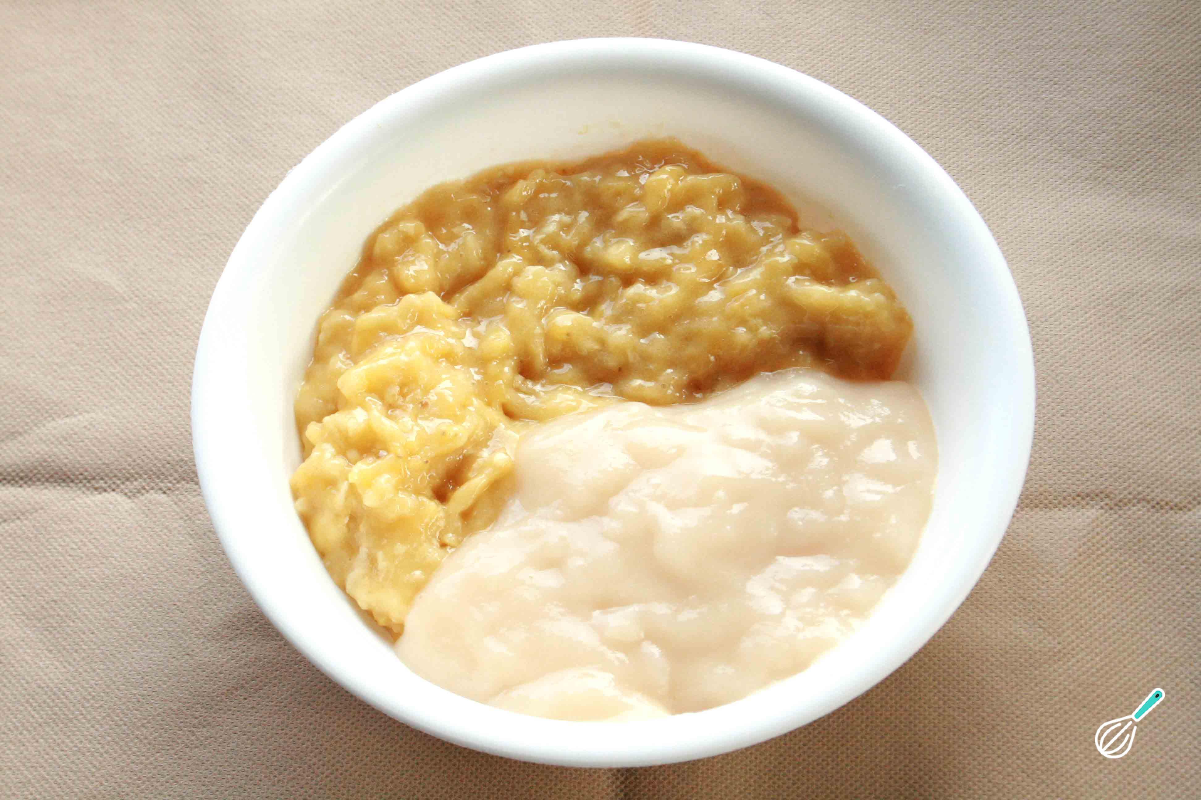 Noutra tigela misture os ingredientes úmidos: a banana e o purê de maçã. O purê de maçã deverá ser sem açúcar, você pode fazer em casa simplesmente assando ou cozendo as maçãs até que fiquem macias - confira esta receita de purê de maçã simples.
