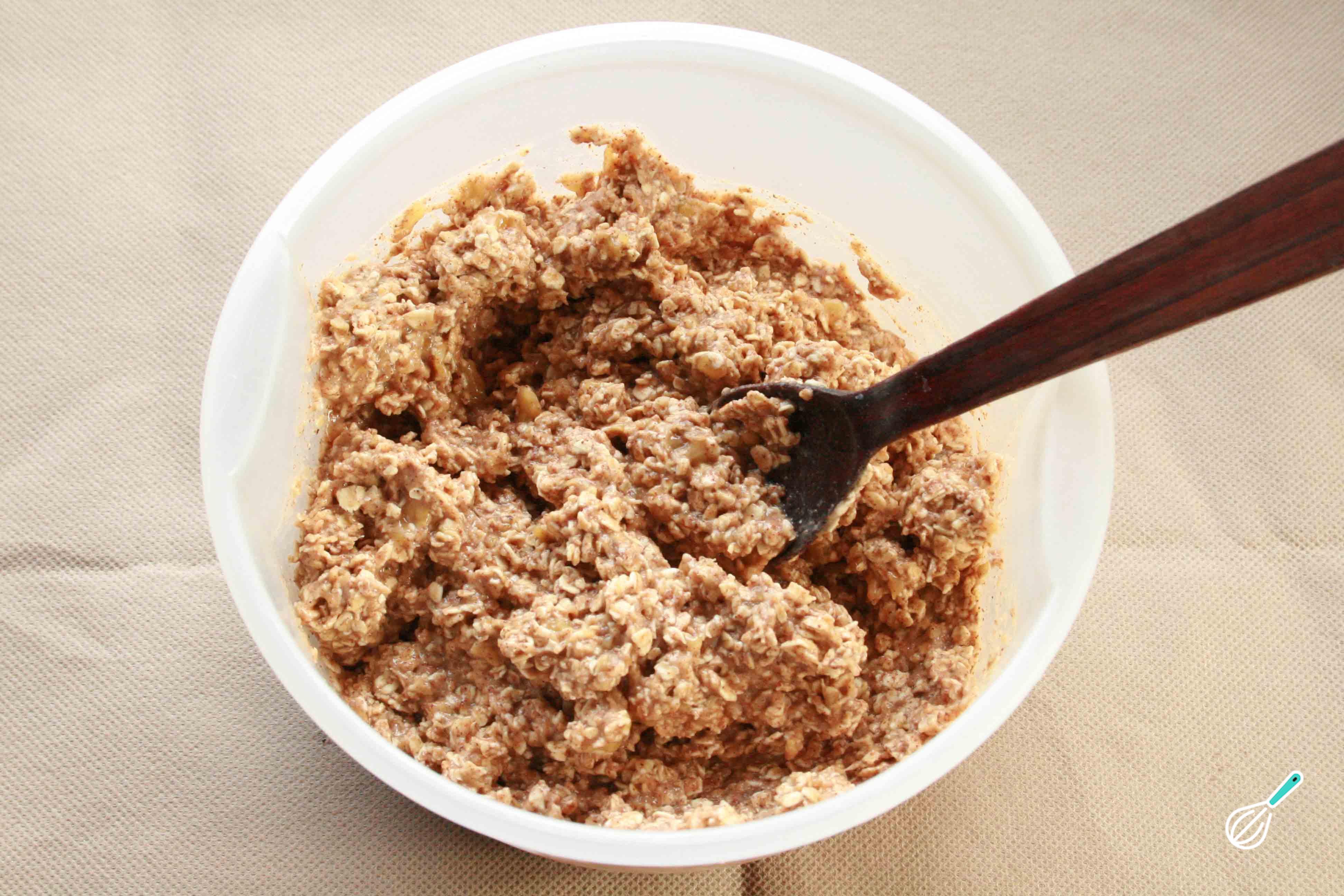 Junte os ingredientes úmidos aos secos e misture muito bem. O resultado será uma massa de cookies de aveia um pouco espessa e grudenta.
