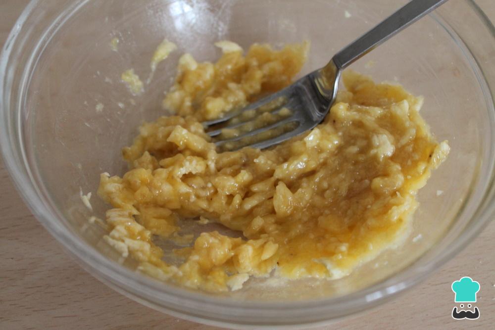 Descasque as bananas, corte-as em pedaços pequenos e pique-as com um garfo sem amassar demasiado (é importante manter um pouco da textura da banana para que os cookies não fiquem moles demais).