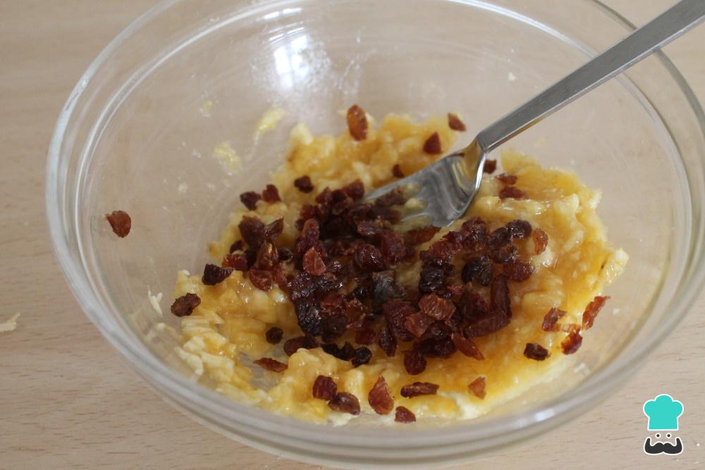 Pique a uva passa, especialmente se forem grandes, e misture com as bananas.