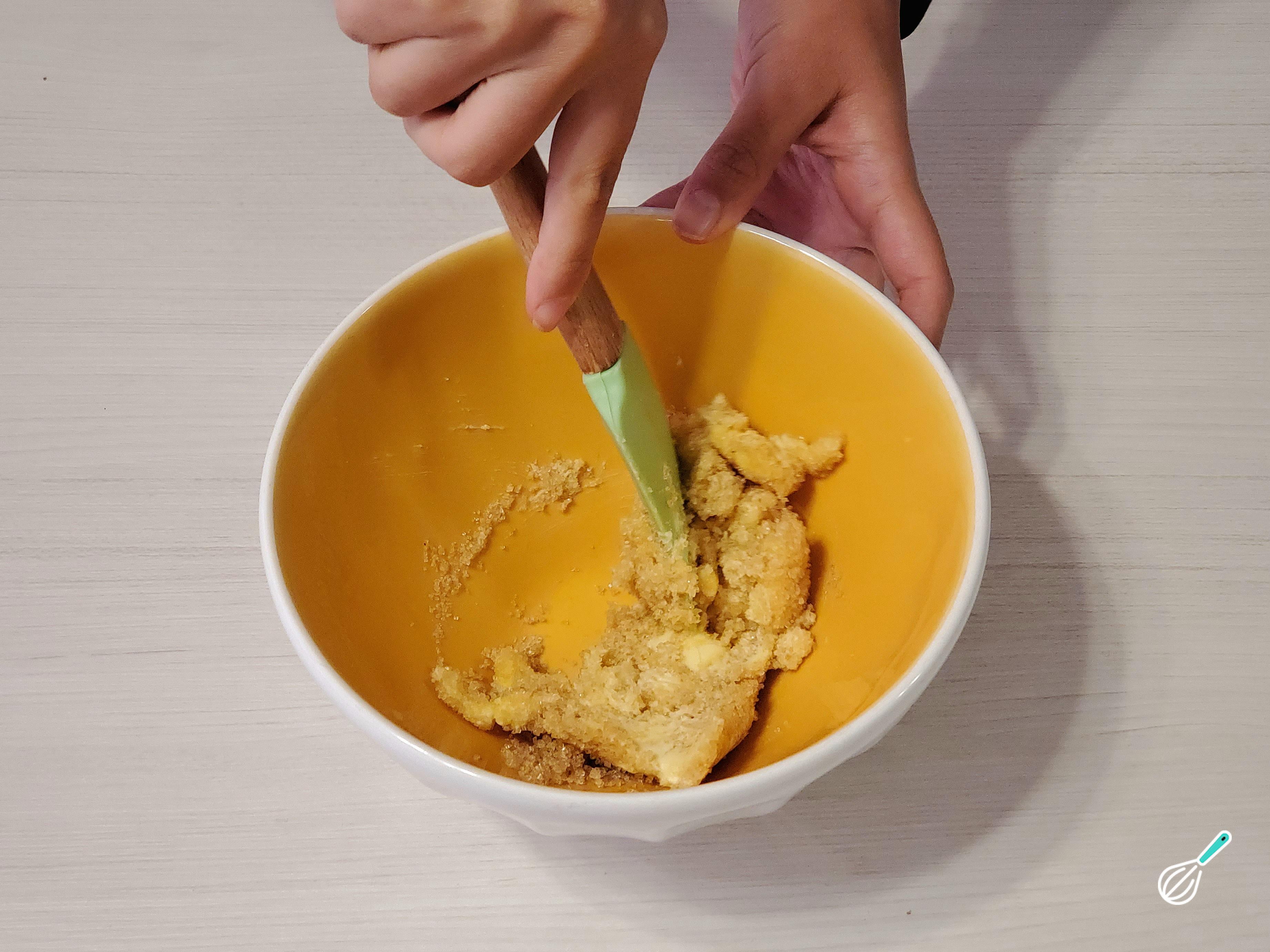 Comece amolecendo a manteiga. Deve estar em temperatura ambiente, se a manteiga estiver muito dura você pode aquecê-la alguns segundos no micro-ondas, mas sem deixar derreter. Adicione o açúcar mascavo por cima e continue mexendo até formar uma pasta bem lisa.