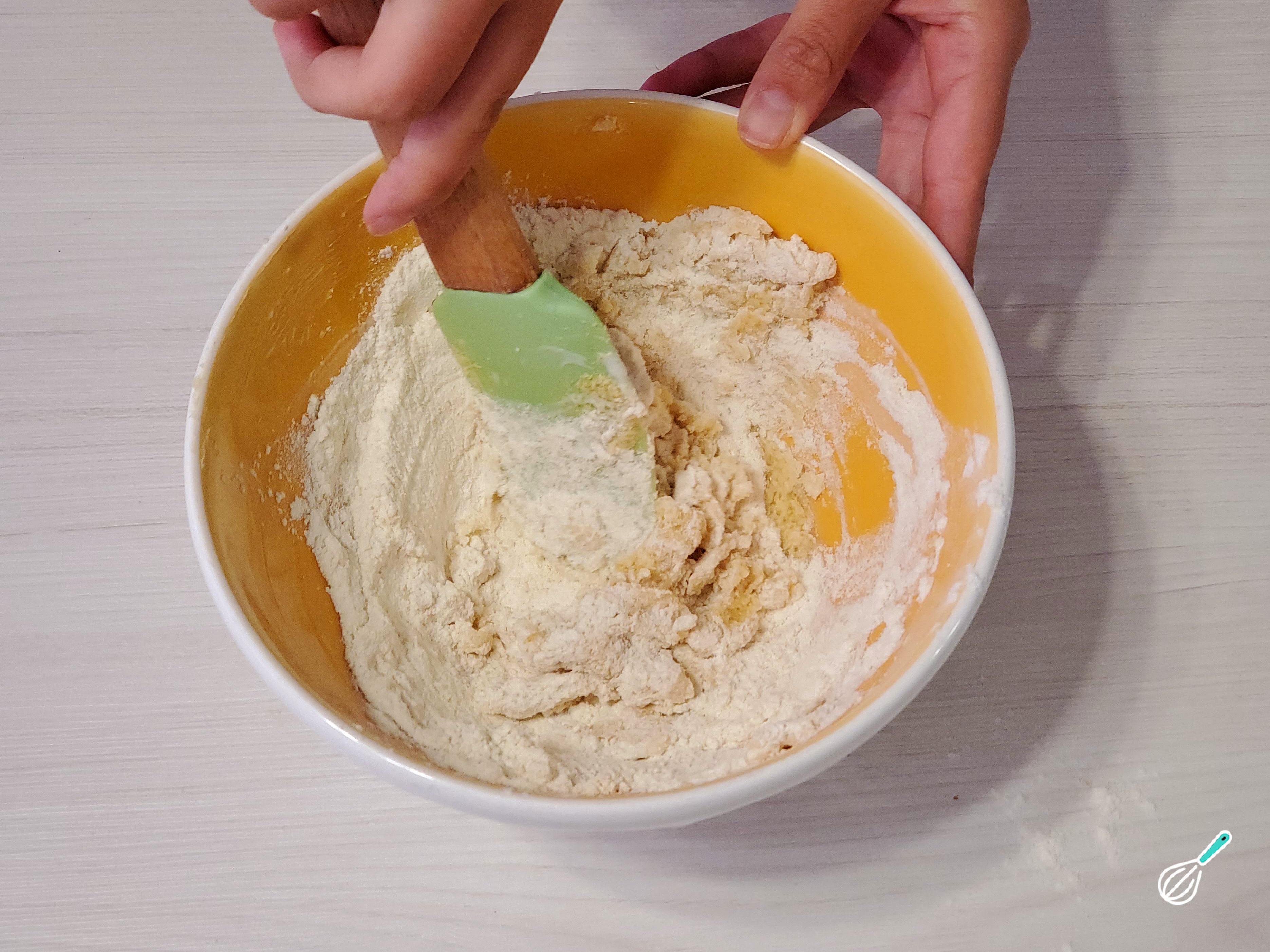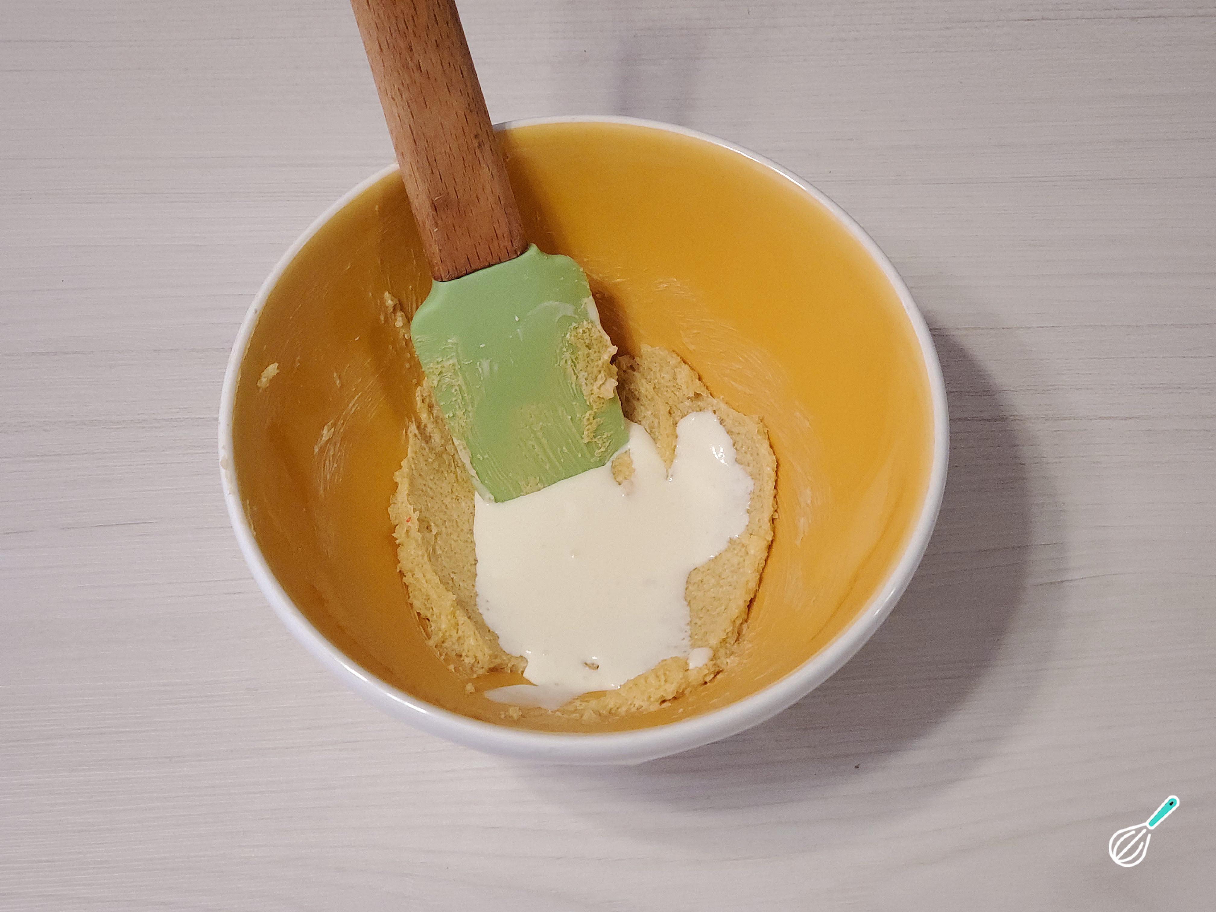 Adicione o leite e continue mexando com uma espátula até que os ingredientes estejam integrados.