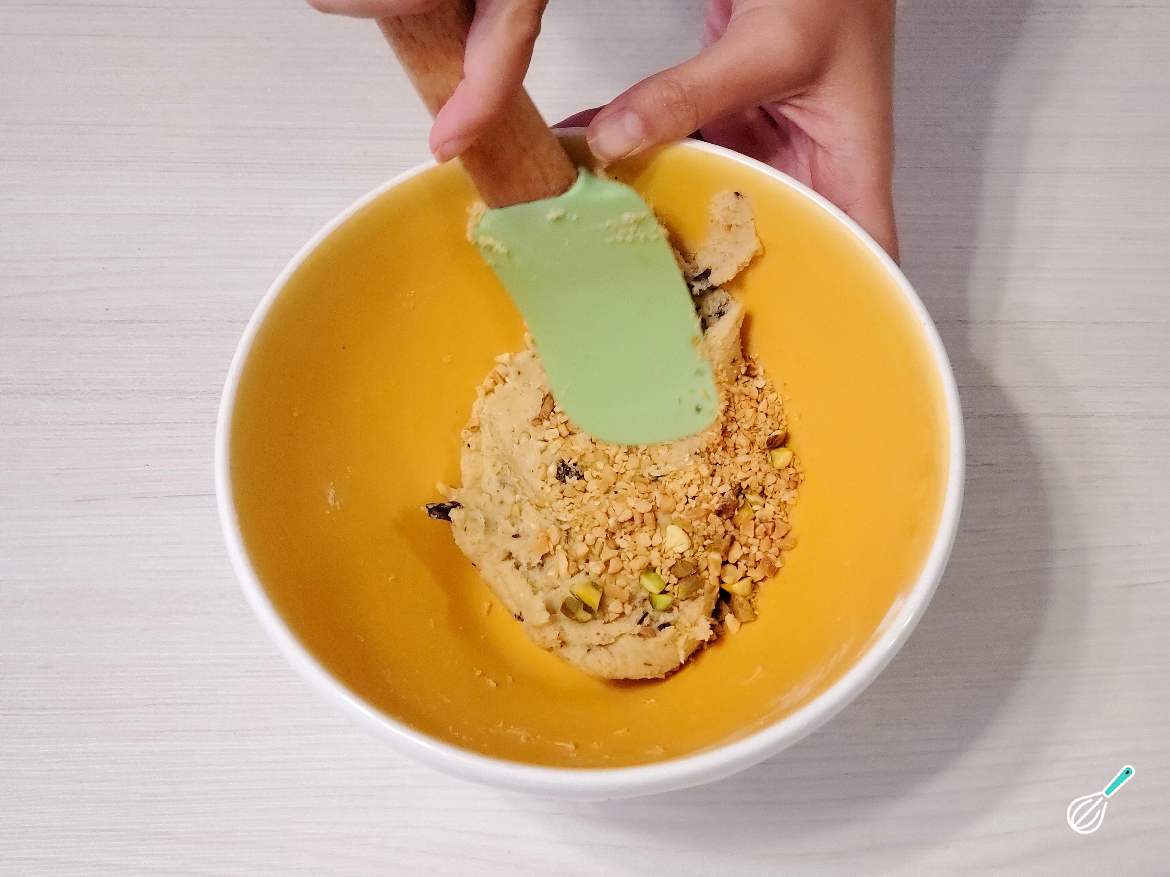 Adicione gotas de chocolate e/ou nozes torradas e picadas. Sove um pouco mais para que fiquem distribuídos pela massa.