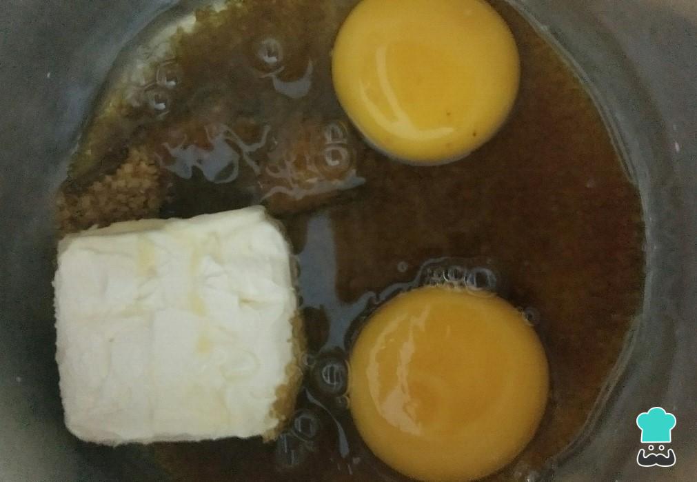 Para fazer a massa desse cookie americano comece por misturar muito bem o açúcar com a manteiga e os ovos, de preferência usando um fouet ou batedeira elétrica, até dissolver os grãos de açúcar.