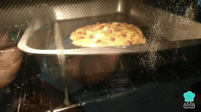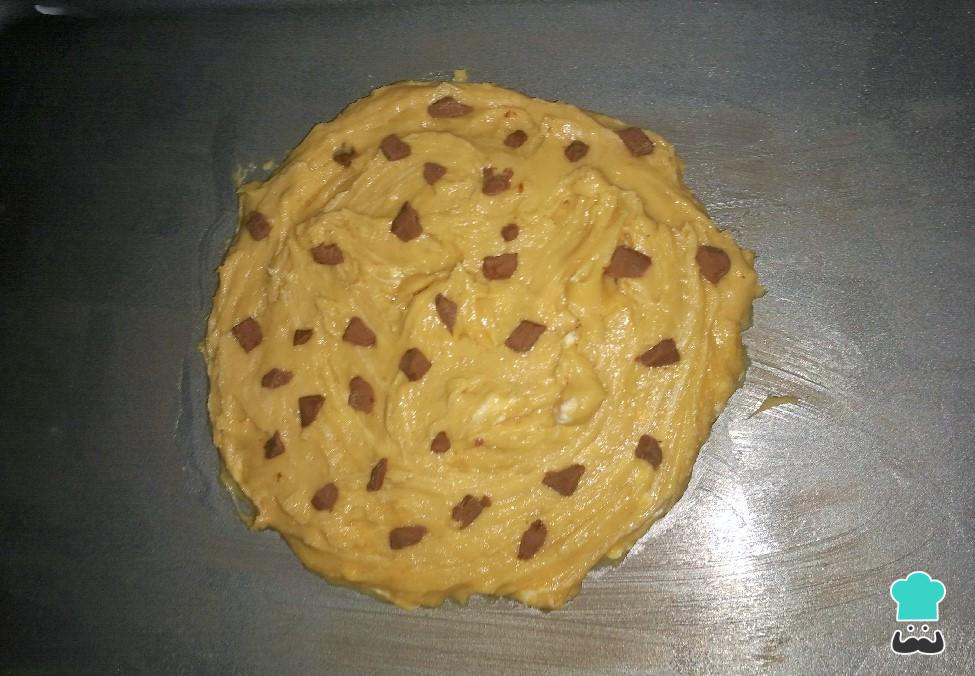 Espalhe a massa em um tabuleiro de forno untado ou forrado com papel manteiga e confira um formato arredondado. Acrescente as gotas de chocolate a gosto e, se quiser, também pode juntar alguns frutos secos.