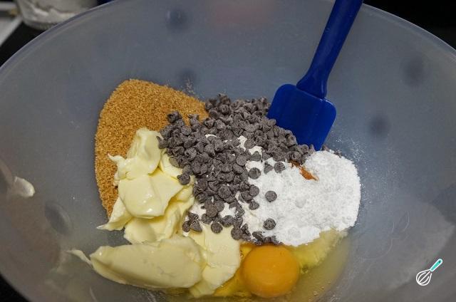 Para preparar esta receita de cookies de chocolate americanos a primeira coisa a fazer é ligar o forno a 180°C. Depois coloque numa tigela coloque todos os ingredientes.