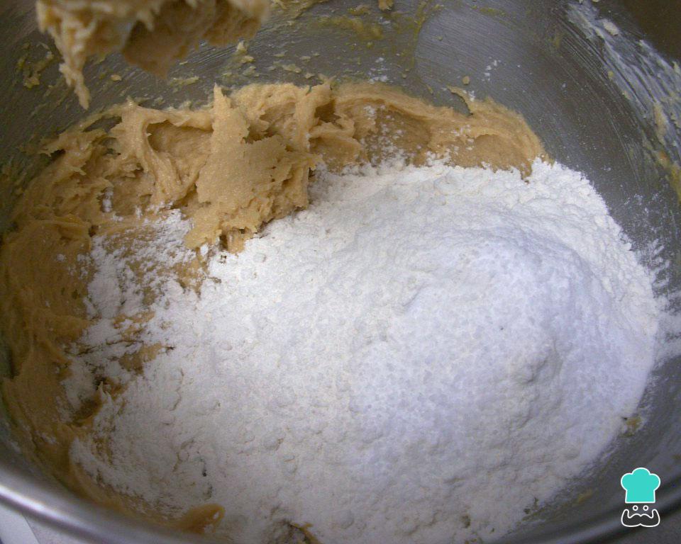 Peneire a farinha de trigo e adicione na tigela com a massa dos cookies americanos. Peneire também o bicarbonato de sódio e o sal e bata para incorporar.
