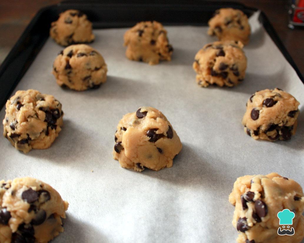 Coloque a massa de cookie (cookie dough) descansando na geladeira por 20-30 minutos e aproveite esse tempo para preaquecer o forno nos 180-200ºC e forrar uma bandeja ou tabuleiro de forno com papel manteiga. Após o tempo de descanso, modele a massa em forma de bolinhas e coloque na bandeja ou tabuleiro de forno, como na foto.